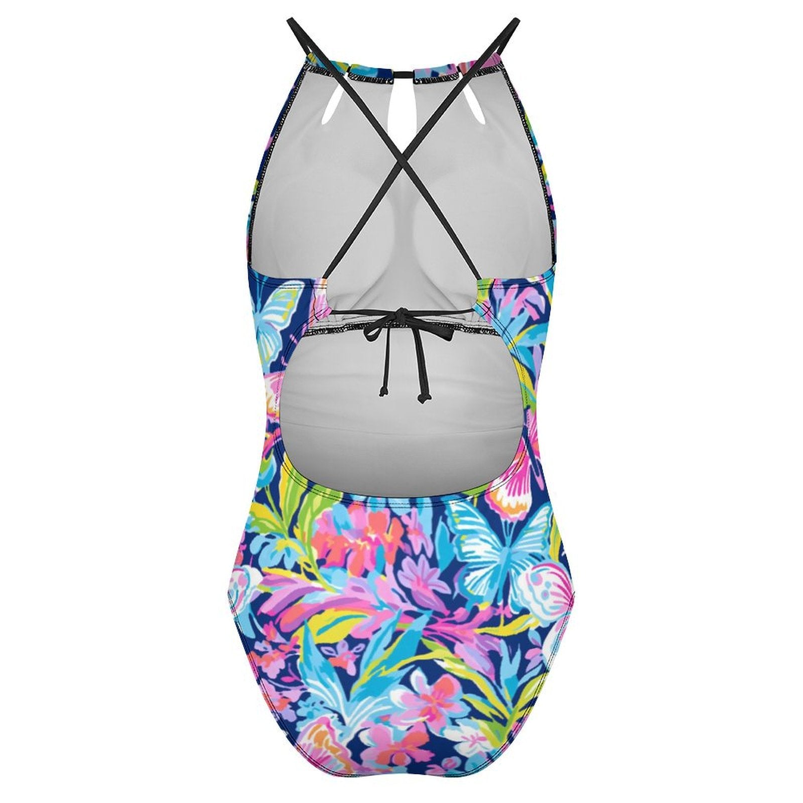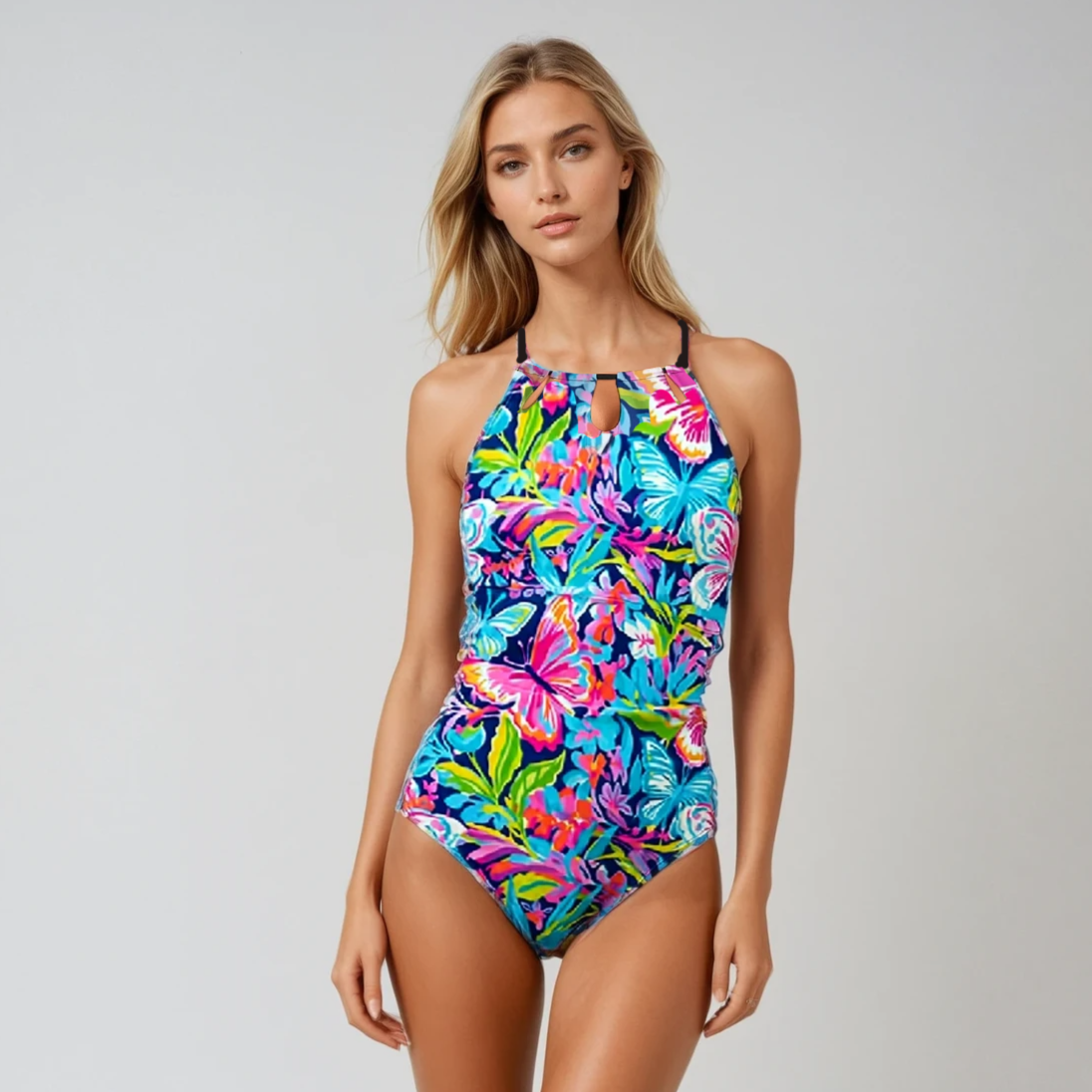 Women's Butterfly Floral Halter Swimsuit, a flattering and feminine one-piece swimsuit designed for sun-soaked days and tropical escapes. This vibrant floral print is a summer favorite—perfect for beach vacations, resort lounging, or poolside relaxation.