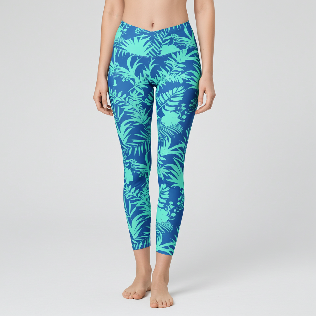These women's 7/8 length surf and swim leggings feature an elegant crossover waistband and a refined tropical blue floral pattern. Offering UPF 50+ sun protection and gentle compression, they combine comfort with a flattering silhouette. Crafted from quick-drying, four-way stretch fabric and equipped with practical pockets, these leggings are designed for versatility and performance. Available in sizes XXS to 2XL, they are ideal for swimming, yoga, paddle boarding, or surfing.