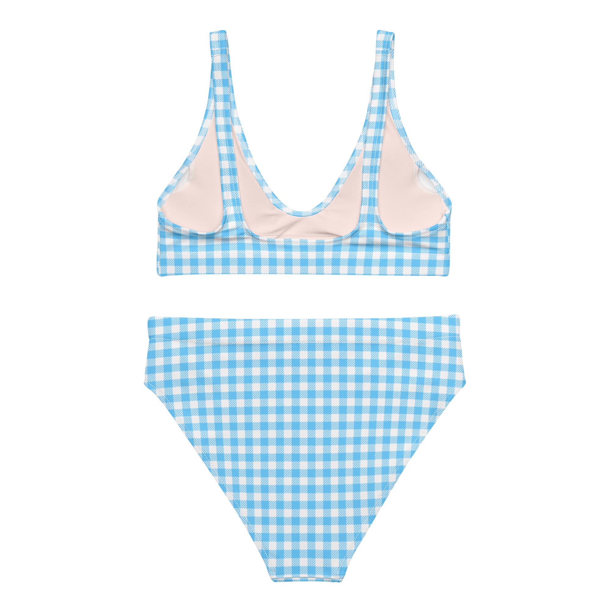 This classic, preppy two-piece bikini pairs a cute bralette top with high-waisted bottoms that hug your curves just right. The smooth, simple lines offer a fun and flattering silhouette, while the cheerful blue gingham print brings a sweet, timeless vibe. Made from eco-friendly fabrics using sustainable practices, this swimsuit is a playful pick for the beach with a low carbon footprint.