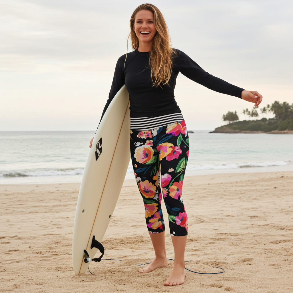 Women's swim pants with UPF sun protection and modesty. Get ready to dive in with these UPF 50 swim capri leggings that offer sun protection while keeping things cool in the Rose Garden print.
