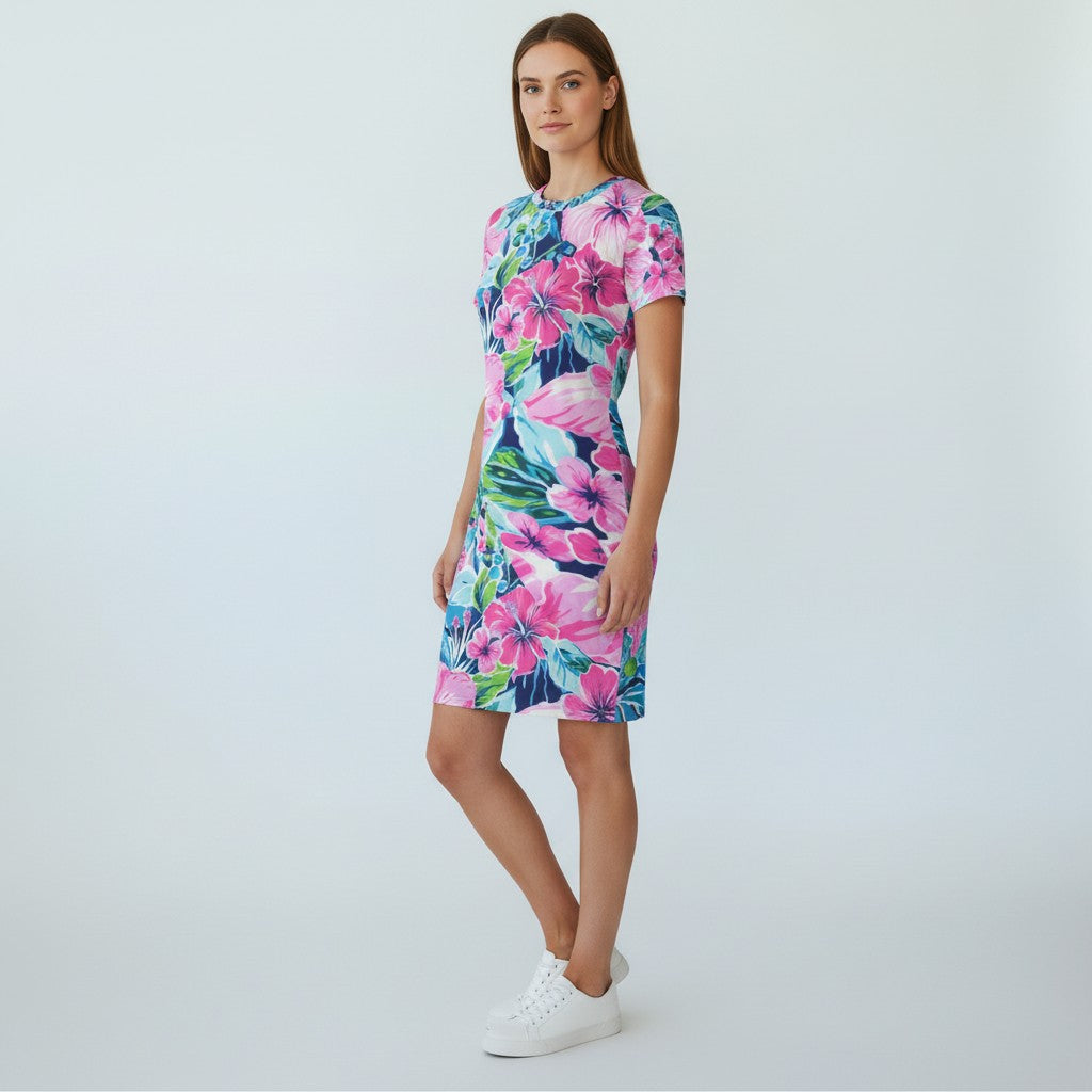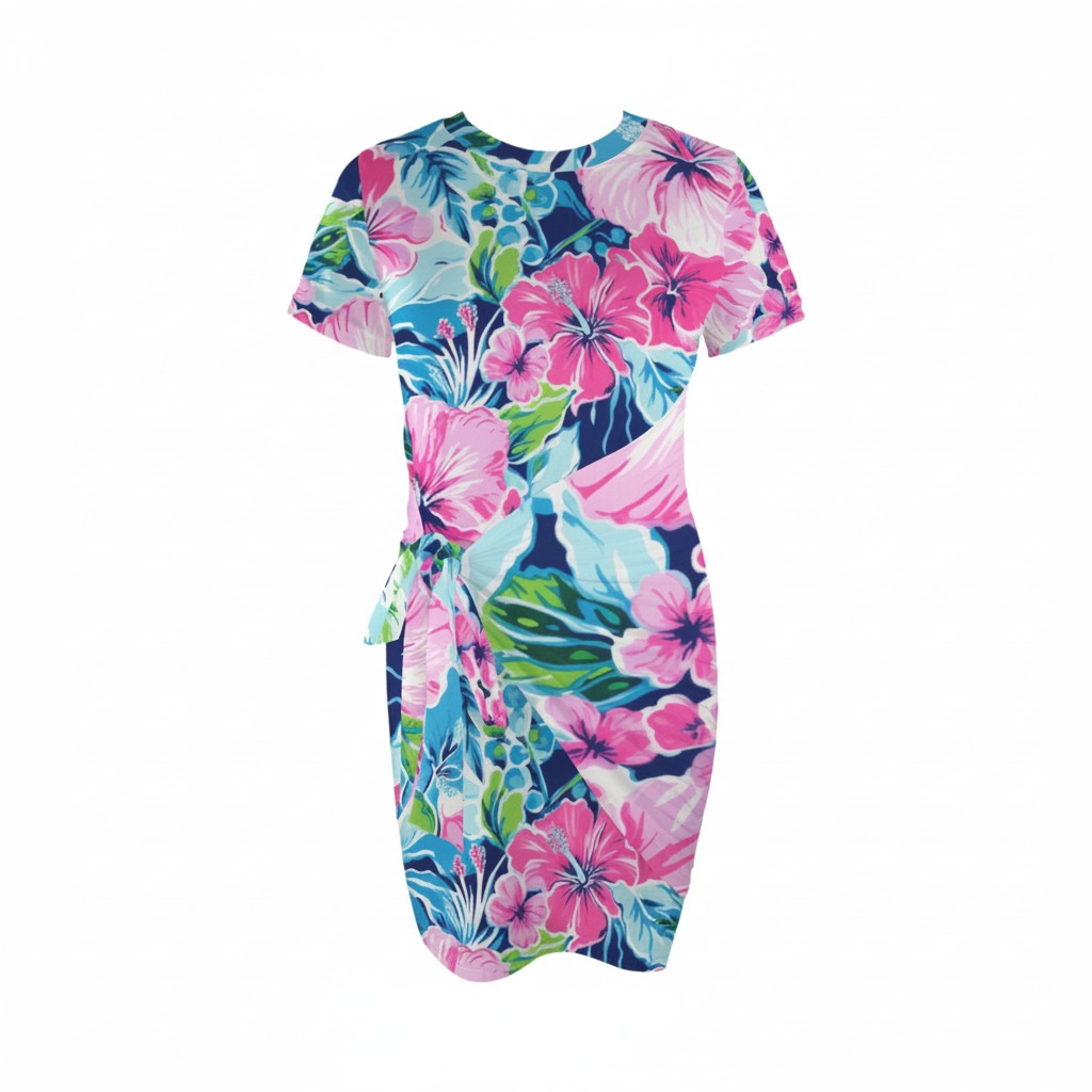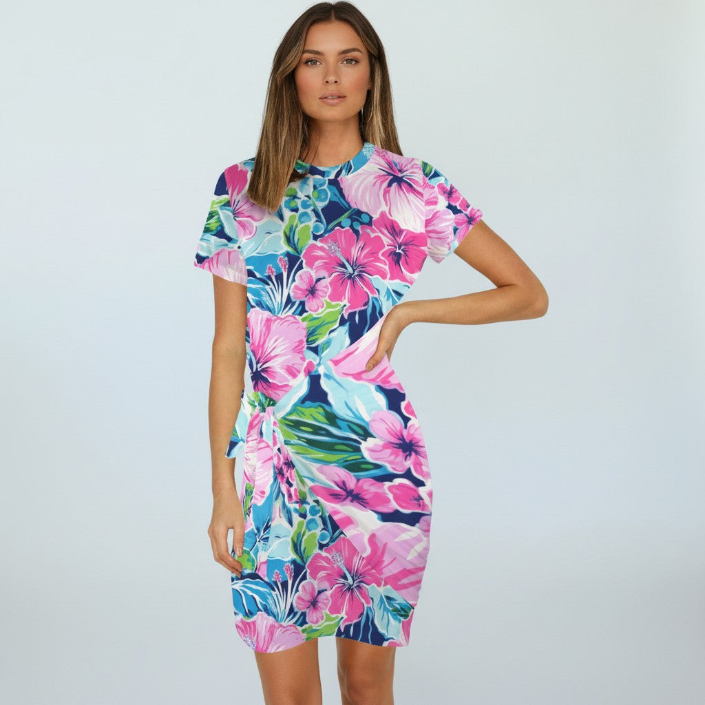 Wrap yourself in tropical vibes with this playful hibiscus-printed tee dress. The fitted silhouette features a flattering tie waist and subtle ruching for an effortless look that transitions seamlessly from casual beach days to dressed-up evenings. Crafted from a stretchy poly-spandex blend, it moves with you while keeping its shape. Short sleeves and a relaxed t-shirt cut make it your new go-to for warm-weather style.