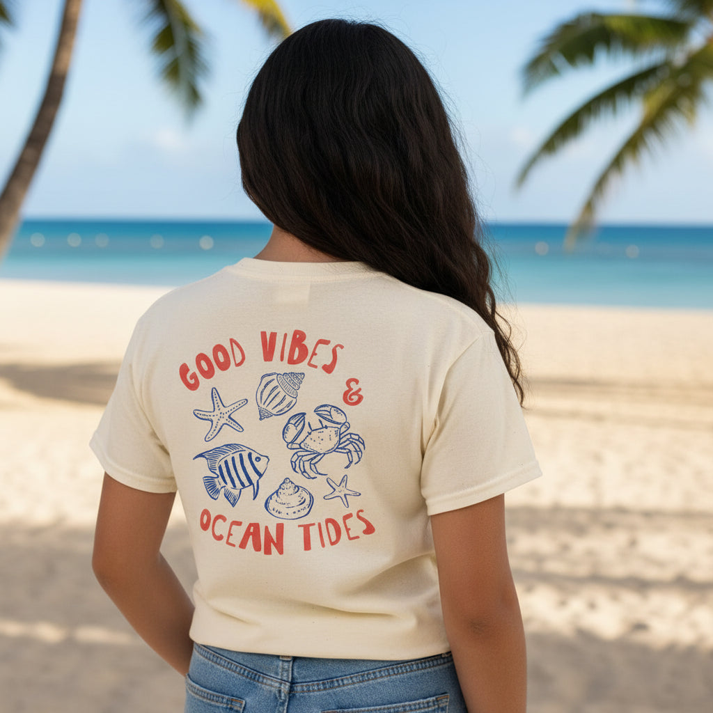 Kids "Good Vibes, Ocean Tides" T-Shirt Back Graphic – 100% Cotton, Made for Beach Days