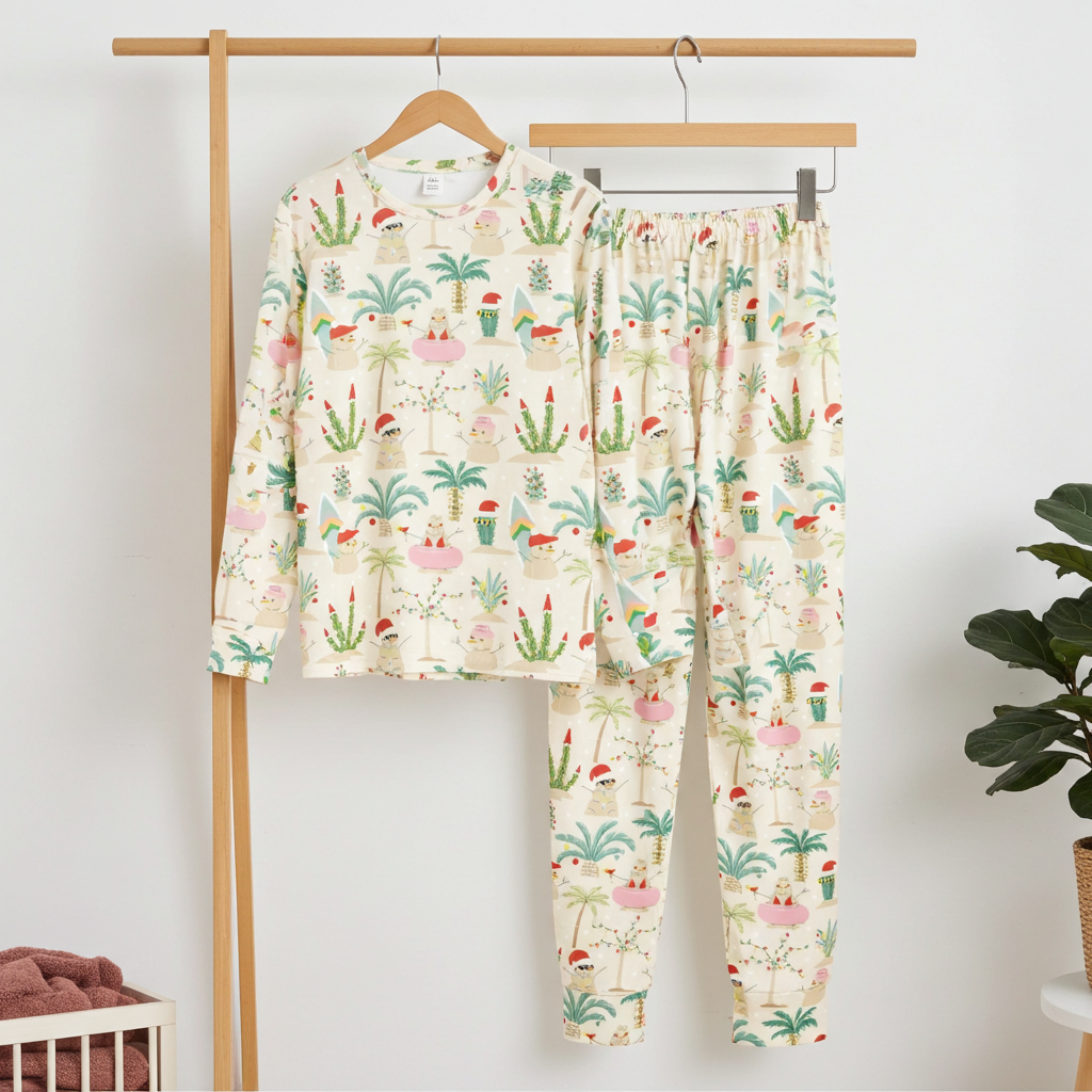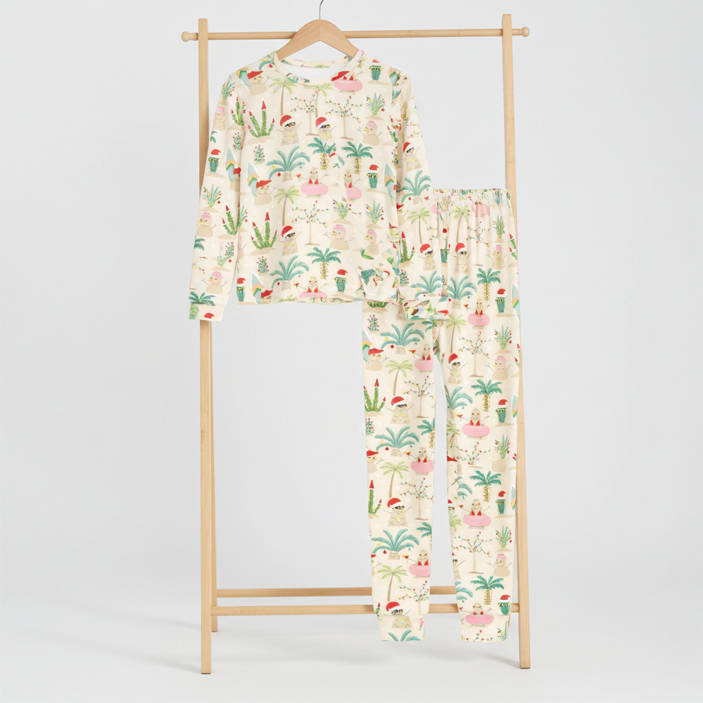 Get ready for cozy holiday fun with this Kids Christmas Pajama Set featuring a Beach Mele Kalikimaka Snowman Party theme! Made from soft, breathable premium poly knit fabric, this set includes a long-sleeve tee and comfy pants with an elastic waistband and leg cuffs for easy wear. Perfect for lounging or sleeping, these PJs keep your little ones warm without overheating. Whether for holiday beach destinations, or relaxing at home, they’re a festive and comfy choice. Don’t forget to pair them with our matching family or His/Hers holiday PJs for extra cheer!