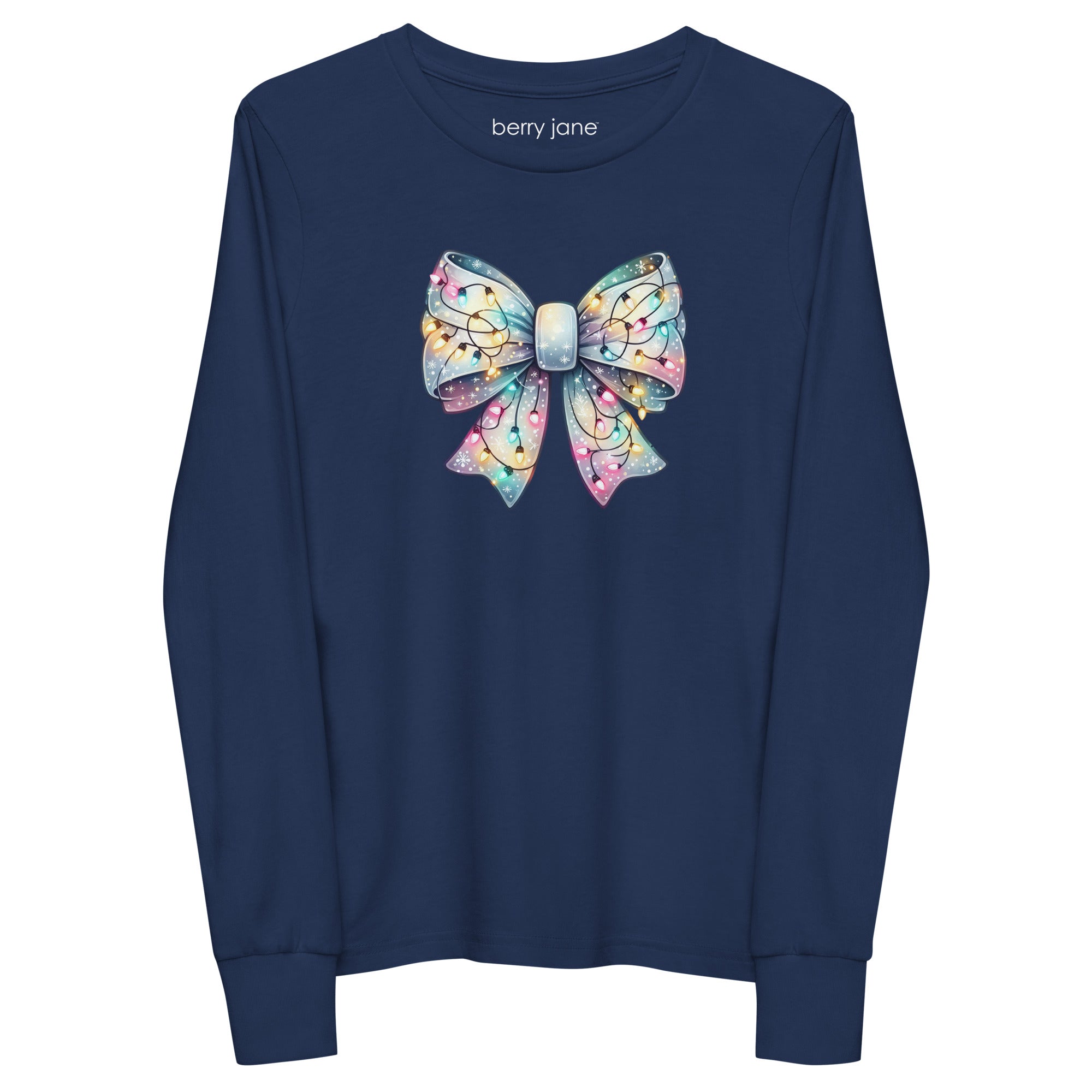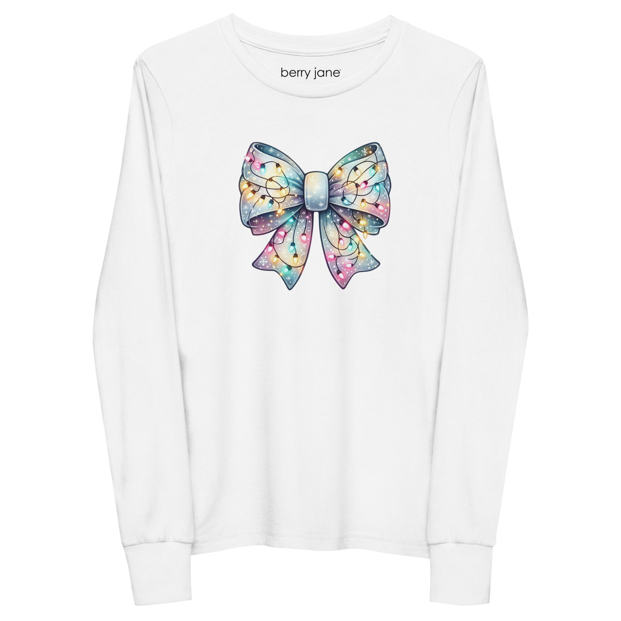 This Girls Coquette Christmas Festive Bow Long Sleeve T-Shirt features a fun graphic with string lights, perfect for holiday cheer. Crafted from soft and durable Airlume combed and ringspun cotton, it offers a comfy regular fit with a classic crew neckline and ribbed cuffs for a cozy feel.