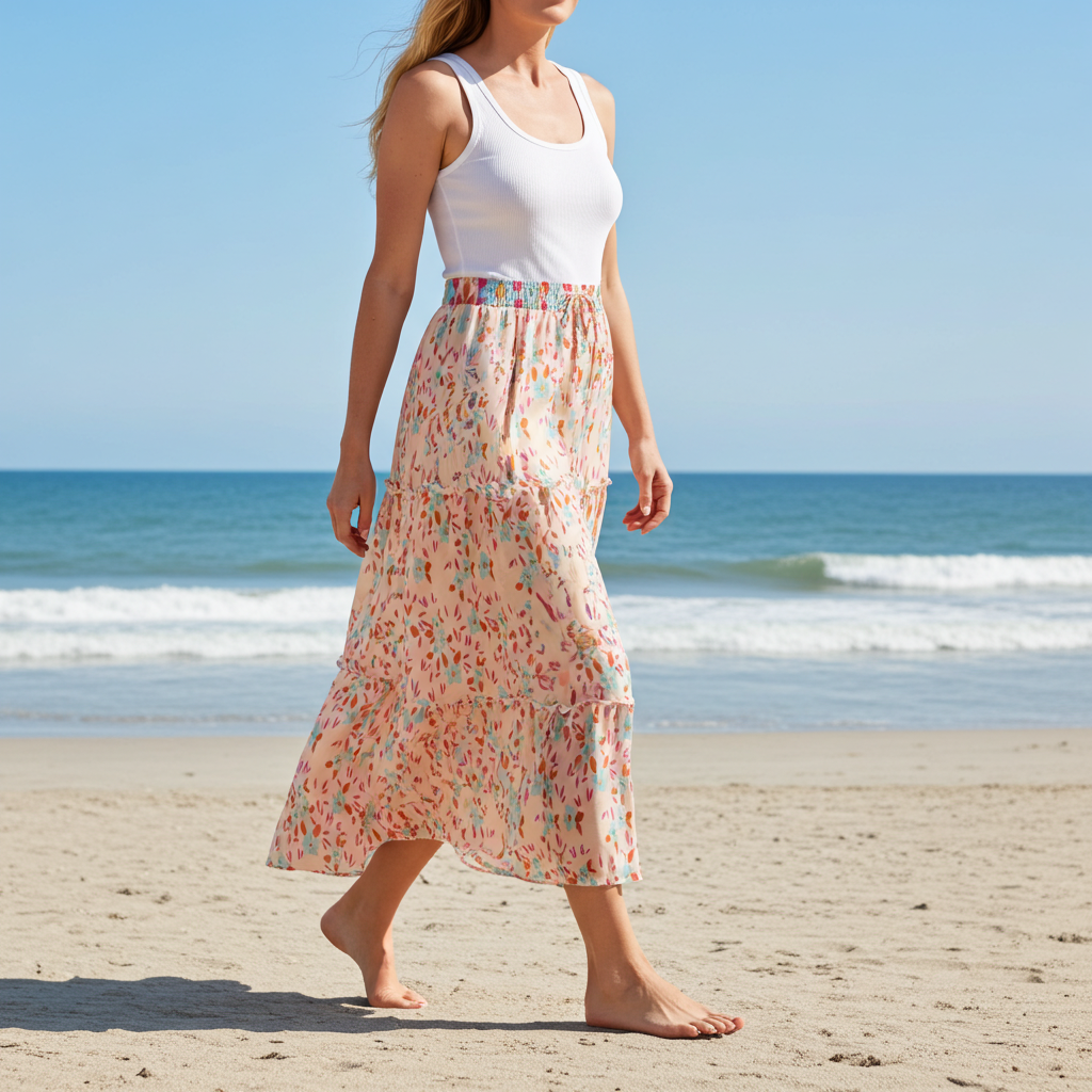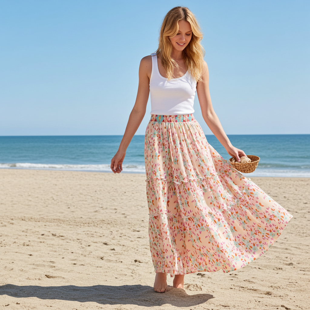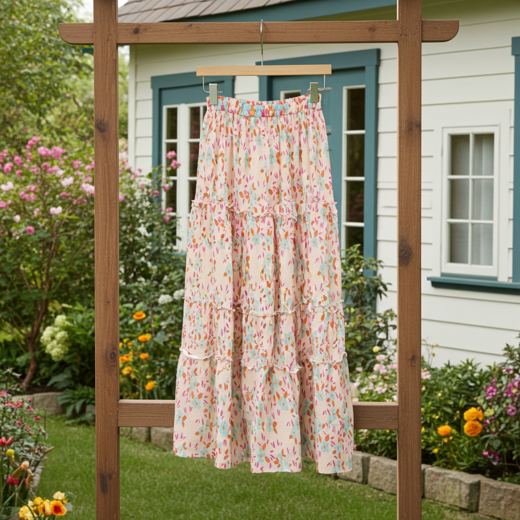 This playful Women's Boho Maxi Skirt features a multi-tiered design with a pretty floral print. Crafted from 95% polyester and 5% spandex with a soft lining, its mid-weight fabric is ideal for spring, fall, or cool nights. The skirt flaunts a high waist and charming frill seams, bringing those perfect bohemian vibes to your wardrobe.