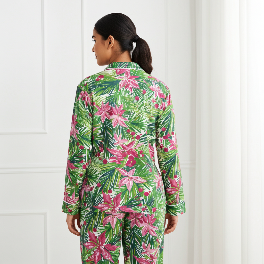 Bring holiday cheer to warmer destinations and beach holidays with our Tropical Floral Christmas Poinsettia Pajamas. Designed with a vibrant poinsettia and palm leaf print, this festive pajama set combines the spirit of Christmas with a tropical twist—perfect for vacations, cruises, or cozy nights at home.