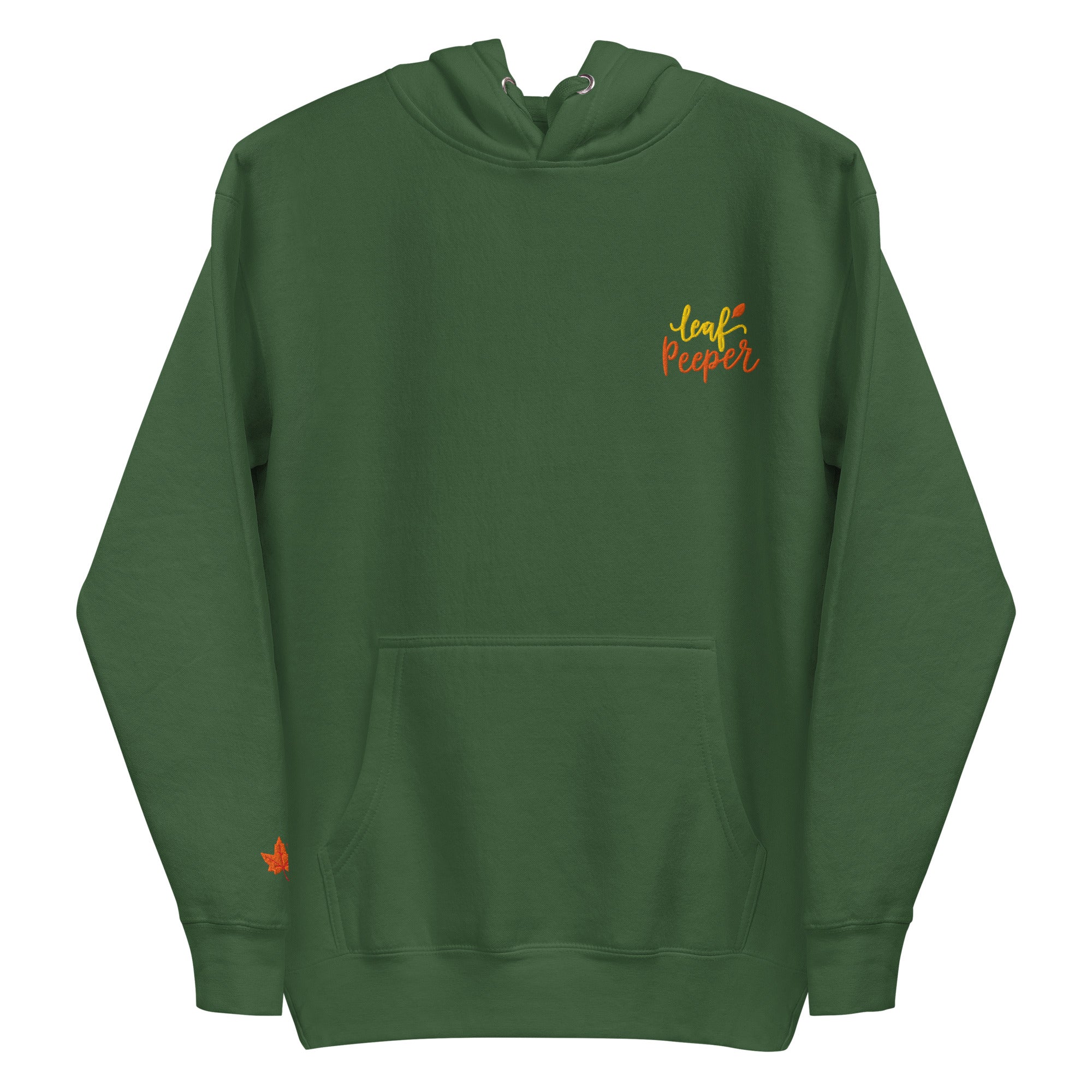 Leaf Peeper Embroidered Fall Hoodie with leaf embroidery on chest pocket area and right sleeve. Ready for fall leaf peeping adventures! This is the softest hoodie you'll ever own with a convenient pouch pocket and warm hood for those chilly evenings.