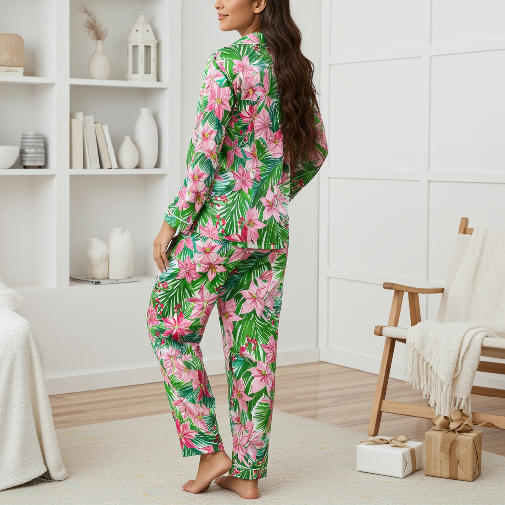 Bring holiday cheer to warmer destinations and beach holidays with our Tropical Floral Christmas Poinsettia Pajamas. Designed with a vibrant poinsettia floral and palm leaf print, this festive pajama set combines the spirit of Christmas with a tropical twist—perfect for vacations, cruises, or cozy nights at home.