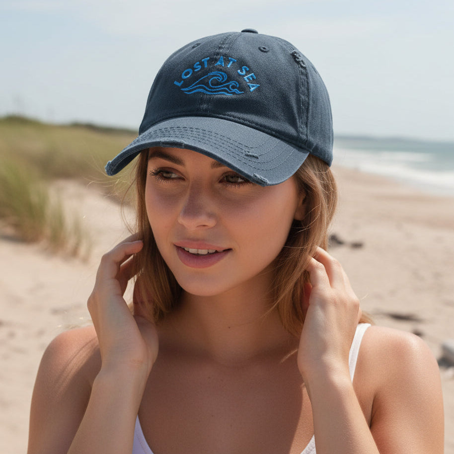'Lost At Sea' embroidered baseball hat in classic Navy Blue. Expand your maritime headwear collection with this fashionable dad hat from our Camden Cove collection. With a slightly distressed brim and crown fabric, it’ll add just the right amount of a worn-in look.