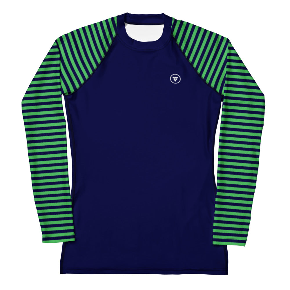 Women’s Navy & Green Stripe Long Sleeve Rash Guard - Add a classic preppy touch to your swimwear collection with this navy and green stripe rash guard. Made with a buttery-soft, four-way stretch fabric that moves with you, this fitted rash guard offers full coverage and UPF 50+ sun protection—perfect for days on the water, the tennis court, or a beachside run.
