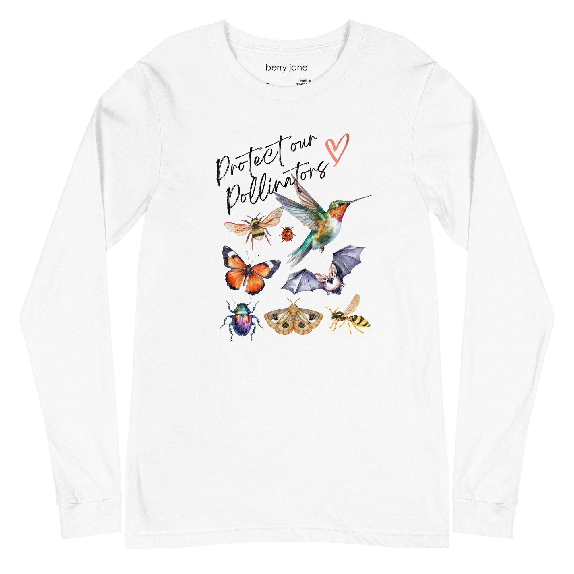 Protect Pollinators Long Sleeve Graphic T-Shirt, for Gardeners or Nature Lovers. Features a vibrant graphic print of all our favorite garden pollinators. Bee, Hummingbird, Butterfly, Moth, and friends. This long sleeve tee is perfect for fall and spring. Combine it with your favorite jeans, and layer it with a button-up shirt, a zip-up hoodie, or a cozy vest.