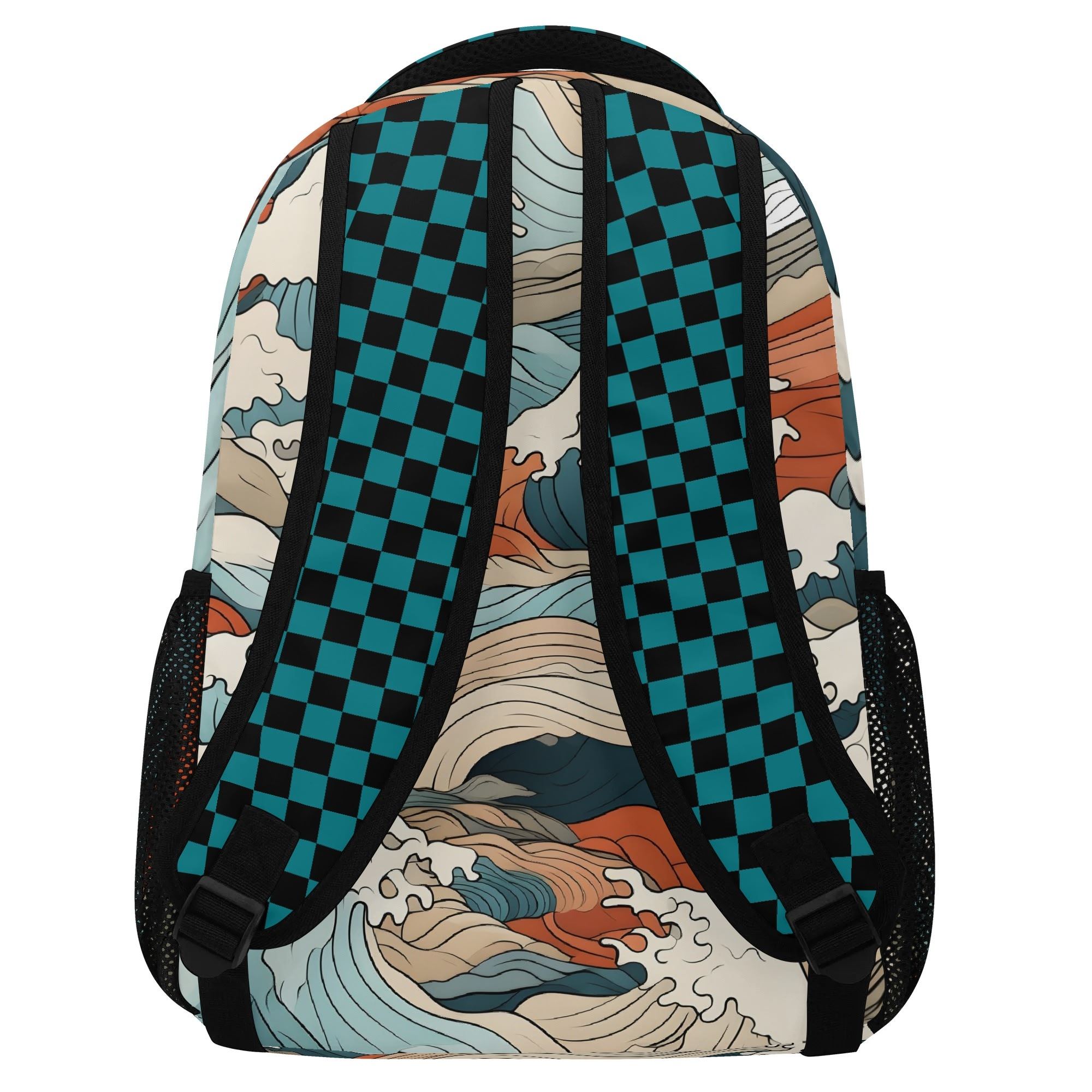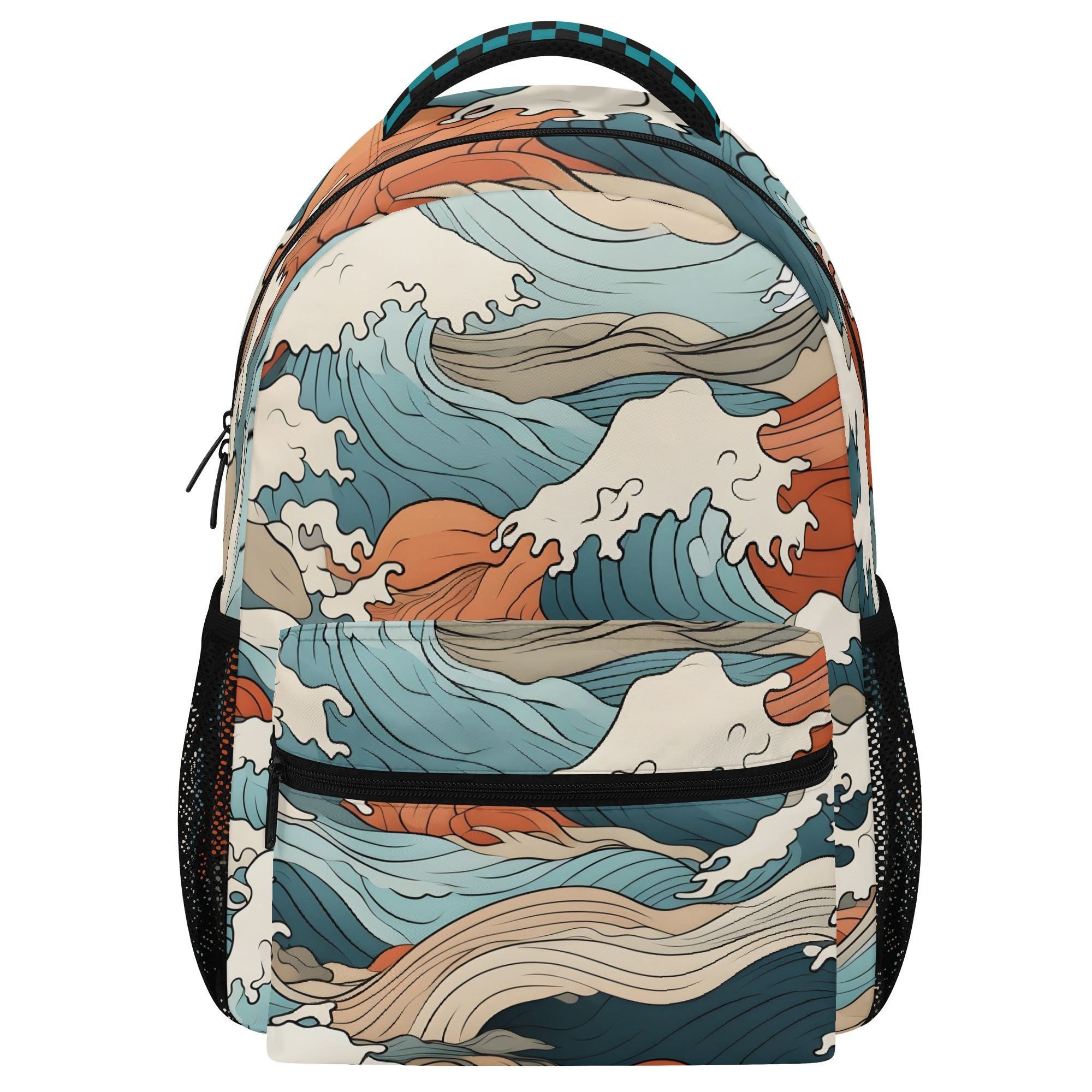 15.5" Large Backpack, Japanese Wave Art with Blue Checkered Trim Straps