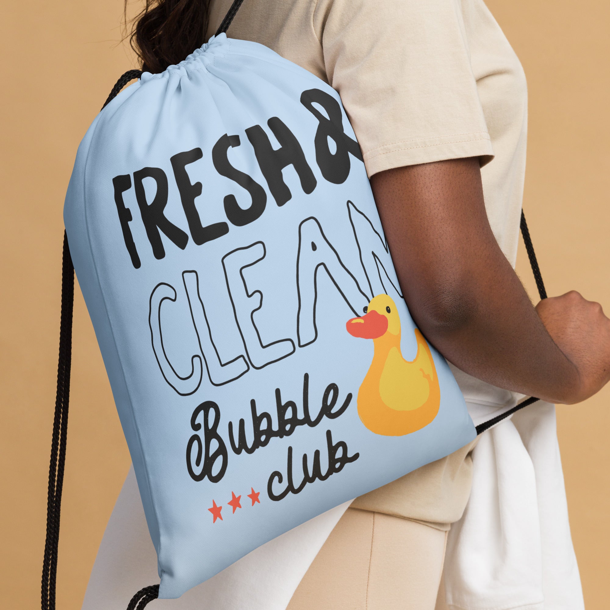 Cute and cool drawstring laundry bag. It's a must-have gym essential that can be used as a travel laundry bag, a beach bag or gym bag. Features a drawstring closure at top, and narrow, contrasting shoulder straps. Cute graphic 'Fresh & Clean Bubble Club' with a rubber ducky. Easy and small to pack for travel or weekend getaways!