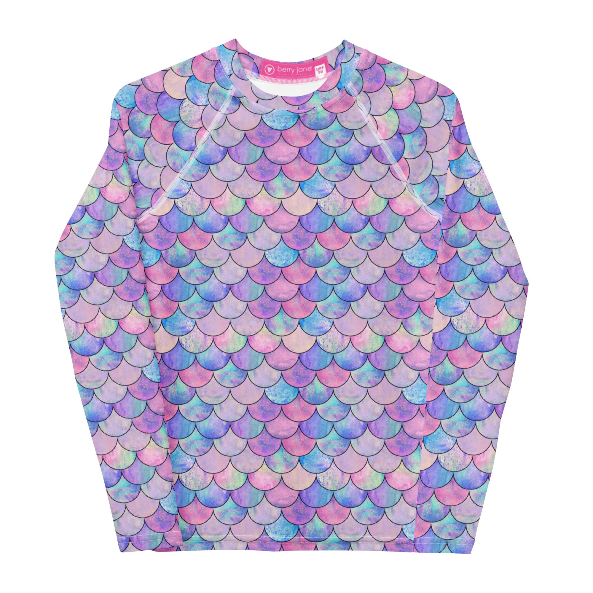 This tween / teen rash guard features a pretty pastel mermaid scales design in shades of pink, turquoise blue and purple, ideal for beach or pool days. With a UPF 50+ rating, it offers reliable sun protection for active young girls. Designed to provide added coverage during surfing, snorkeling, or swimming, it suits sizes 8-20. A refined choice for girls passionate about the ocean, or aspiring mermaids.