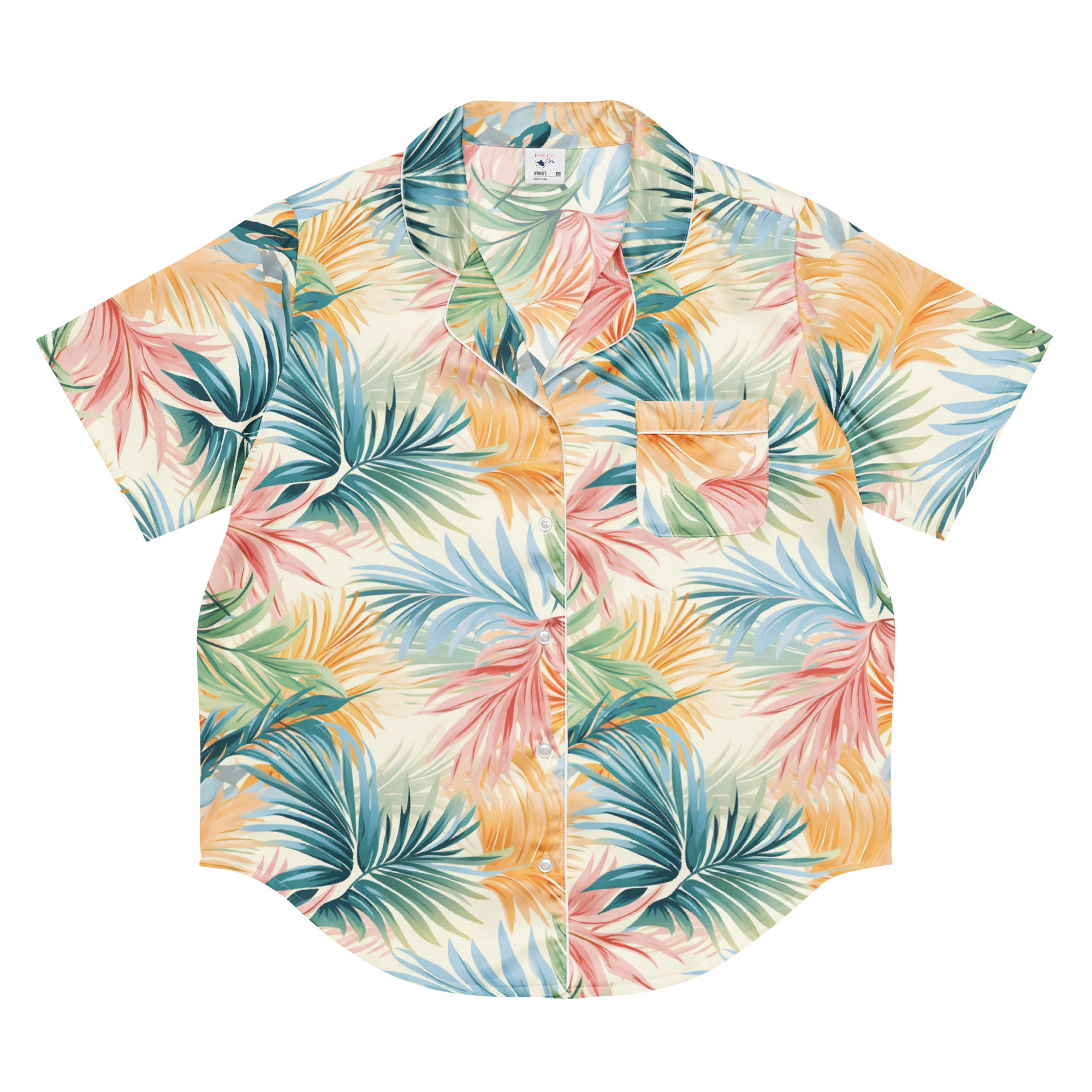 Designed for warm summer nights, the Women’s Tropical Palms Beach Short Sleeve Pajama Top blends lightweight comfort with tropical elegance. Its breathable satin fabric keeps you cool while the palm-inspired design adds a refined, beach-ready touch to your nighttime or lounge wardrobe.