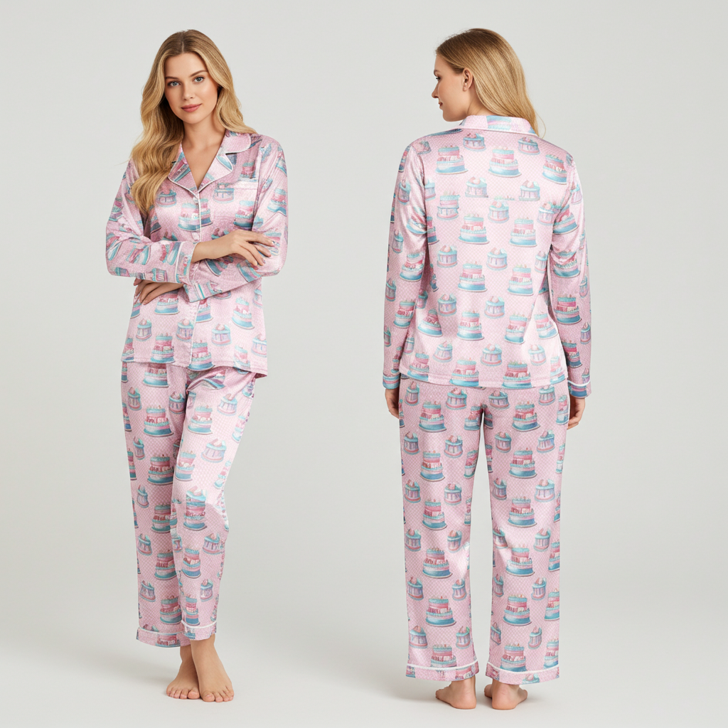 Women's Silky Satin Birthday Pajama Set, Pastel Pink Cakes