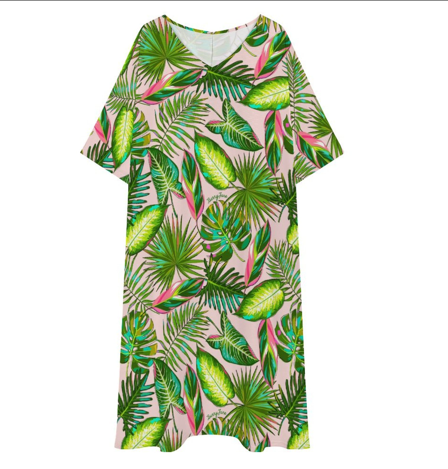 Women's Tropical Floral Maxi Dress Caftan doubles as a chic dress or a breezy beach cover-up. It sports a playful V-neck that fits comfortably and flatters your silhouette with effortless style. This lightweight, slightly stretchy fabric feels amazing all day. Short sleeves, a flowing hem that falls below the knee, side splits, and handy side pockets make it your go-to piece for fun in the sun. Resort-wear, beachwear or cruise.