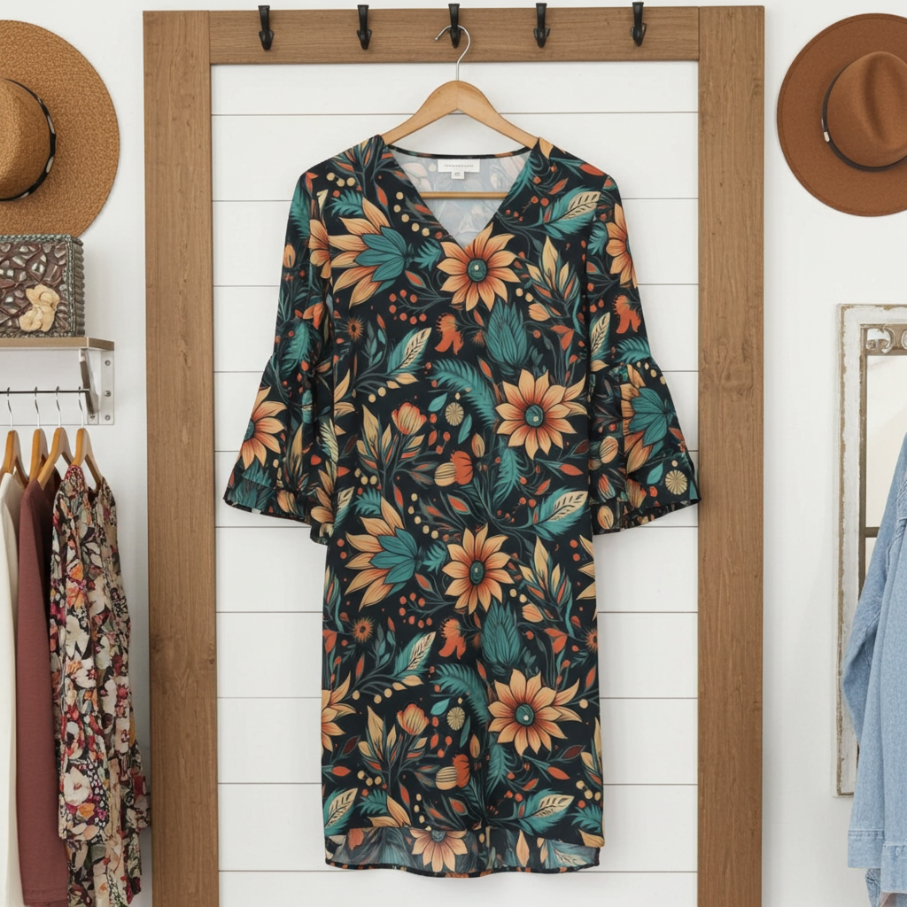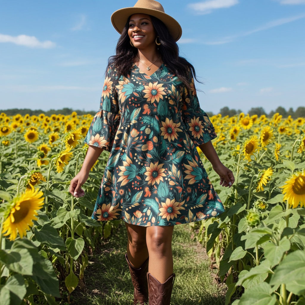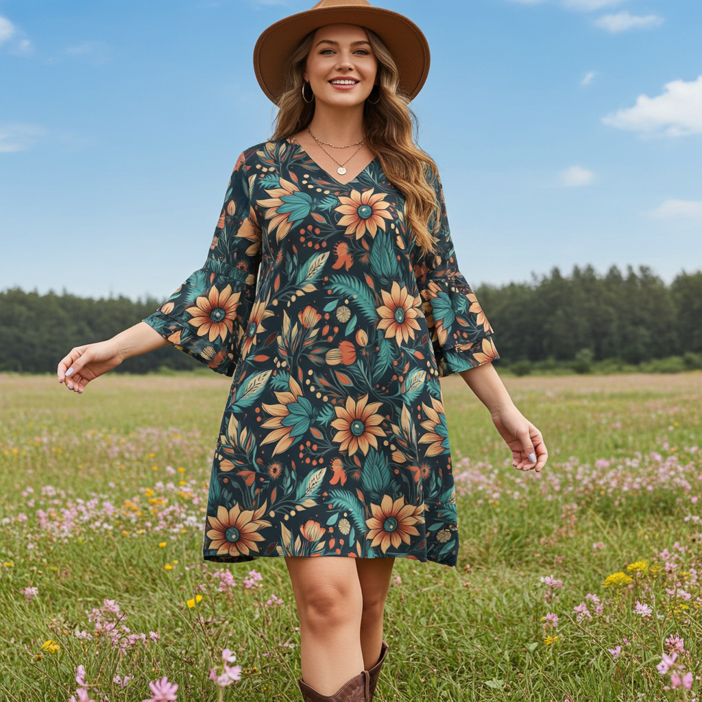 Women's Western Boho A-Line Ruffle Sleeve Mini Dress for effortless style. Made from polyester, it combines comfort with easy care, perfect for crisp fall days or relaxed resort vibes. Its playful 3/4 length ruffle sleeves add a touch of whimsy, while the A-line silhouette flatters every figure. Whether you dress it up with boots and accessories or keep it casual for daytime adventures, this versatile mini dress will be your go-to for a chic, carefree look.