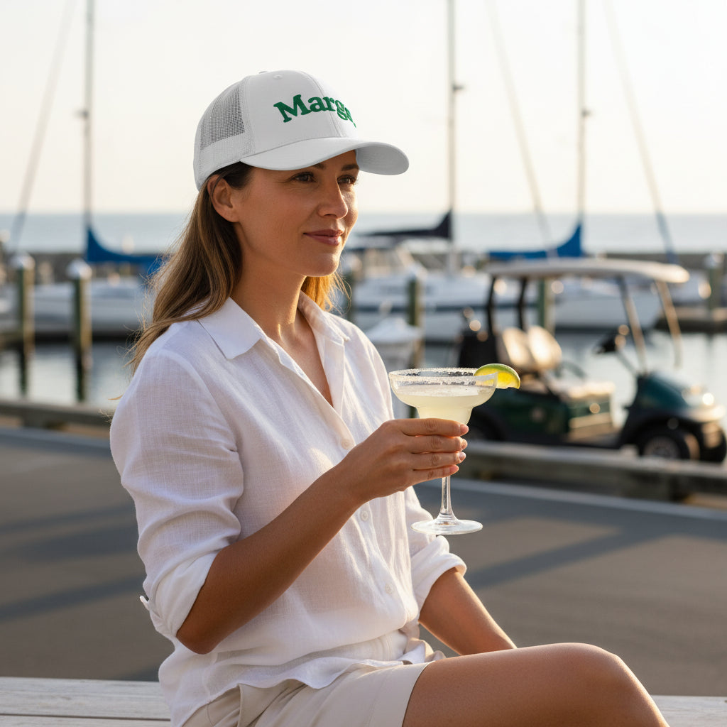 MARGS Embroidered Trucker Cap – Sip, Relax, Repeat. If margaritas are your love language, this MARGS embroidered trucker cap is made for you! Designed for laid-back days and good vibes only, this cap features bold, high-quality embroidery that lets everyone know you're always down for a round. Pair it with your favorite sunnies, a breezy outfit, and, of course, a fresh margarita in hand. Because life’s better with salt on the rim!