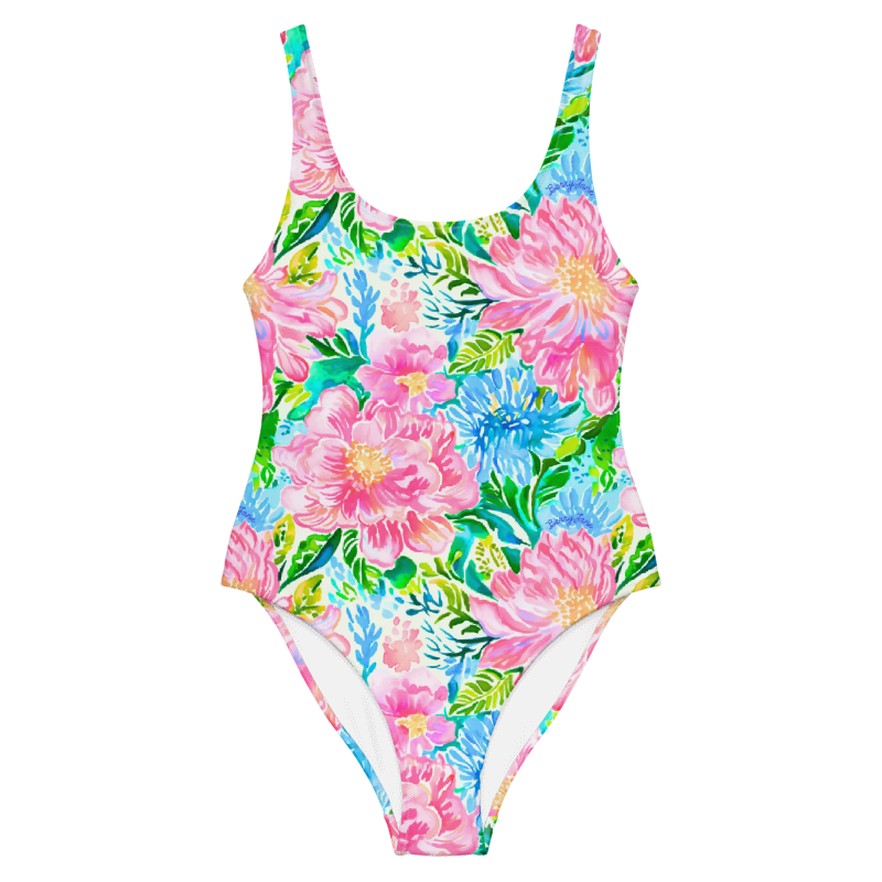 Women's classic one piece swimsuit with preppy spring floral blooms print. With its simple scoop neck and modest cuts, our Women's One-Piece Swimsuit compliments all body types. Stretchy, padded, and built-in UPF 50+, this swimsuit offers excellent comfort, support, and UV protection. Pair it with our matching mens swim trunks for a his and hers couples matching swimsuit look.