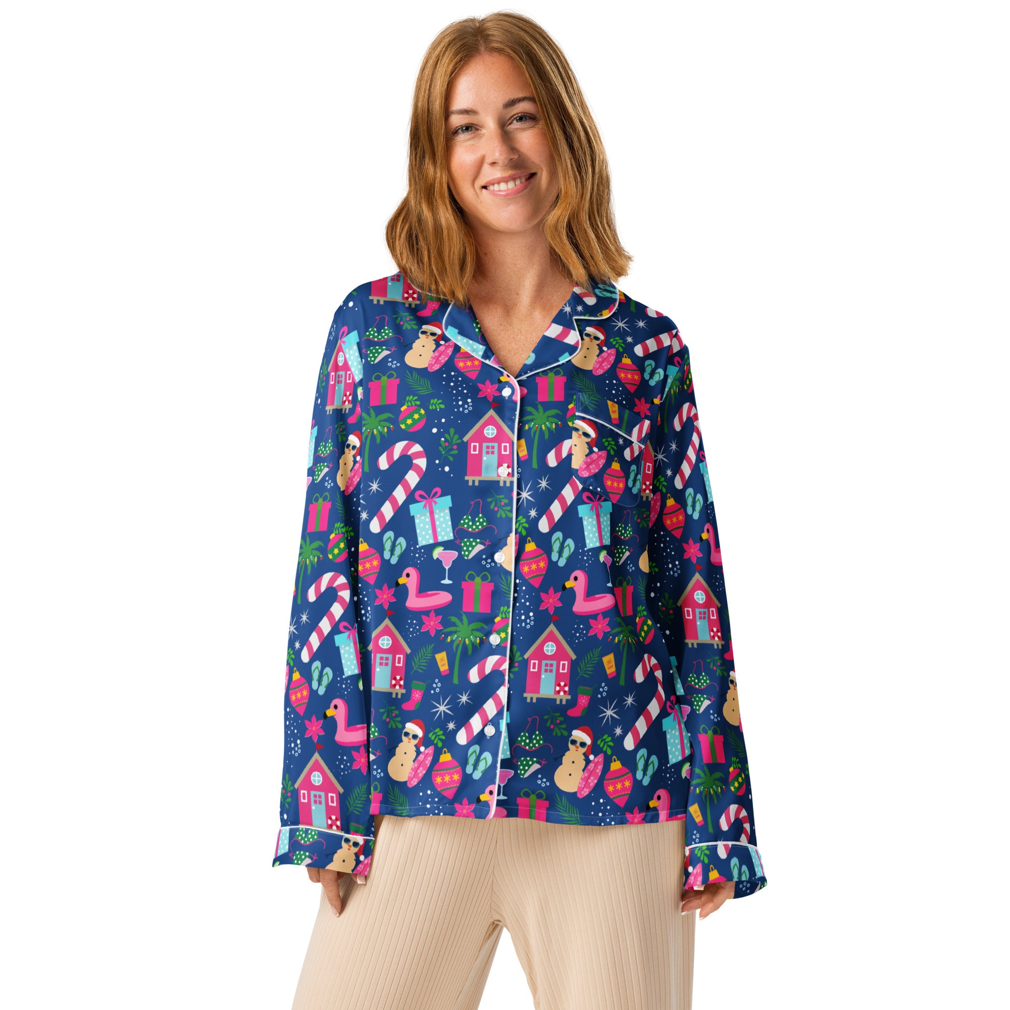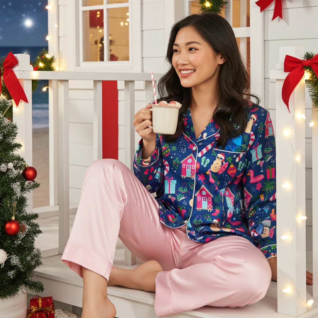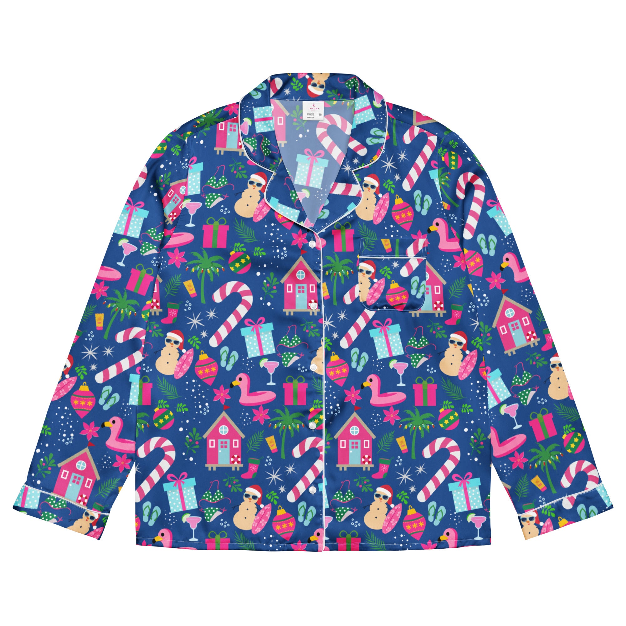 Women's Satin PJs features a Christmas at the Beach Print with Beach House, Flamingo Floaties, Flip Flops, Bikinis and Decorated Palm Trees - everything you'd expect from a beach holiday. This silky pajama top is ideal for a cozy day when you want to feel both comfortable and elegant. It features a relaxed fit, chest pocket, and elegant piping detail.