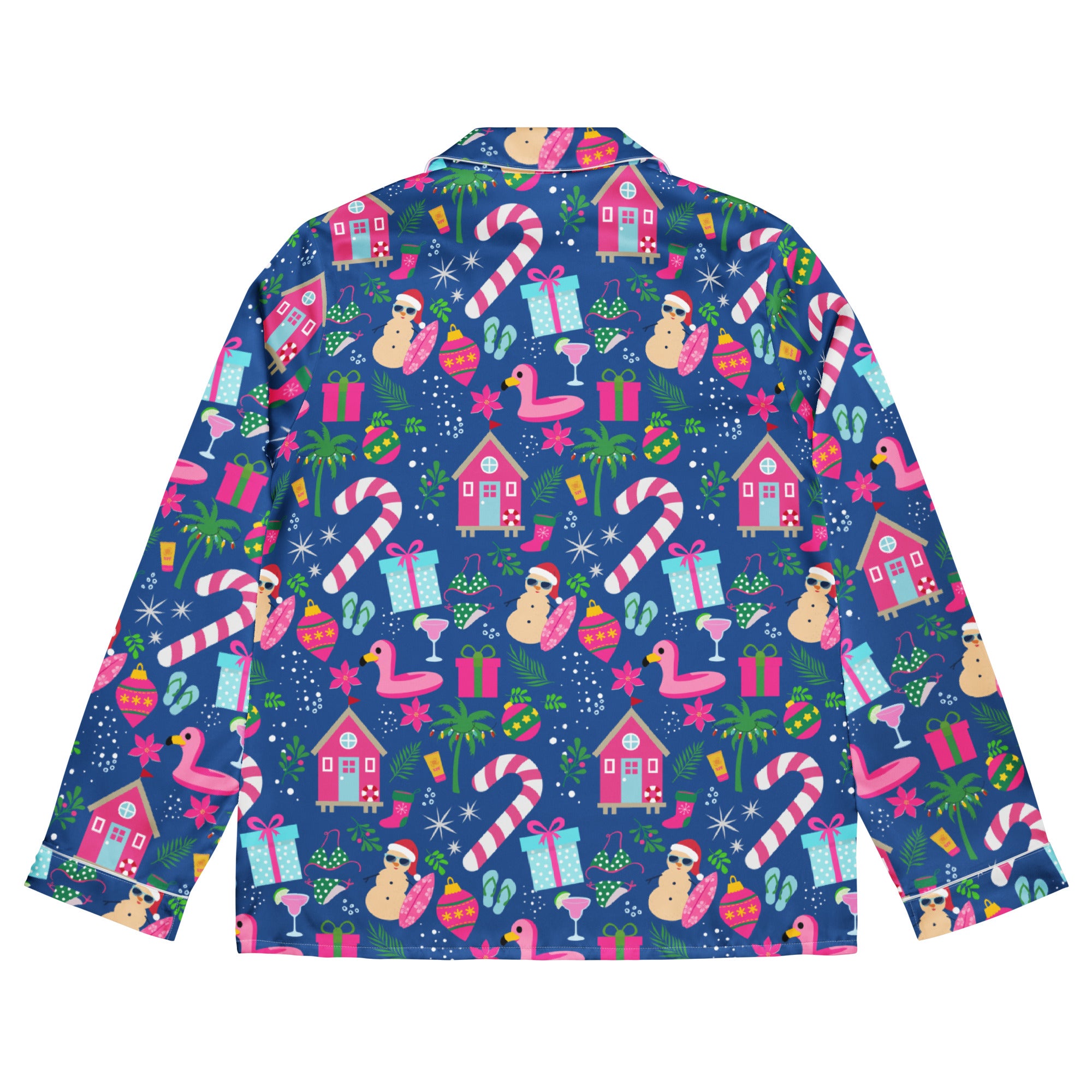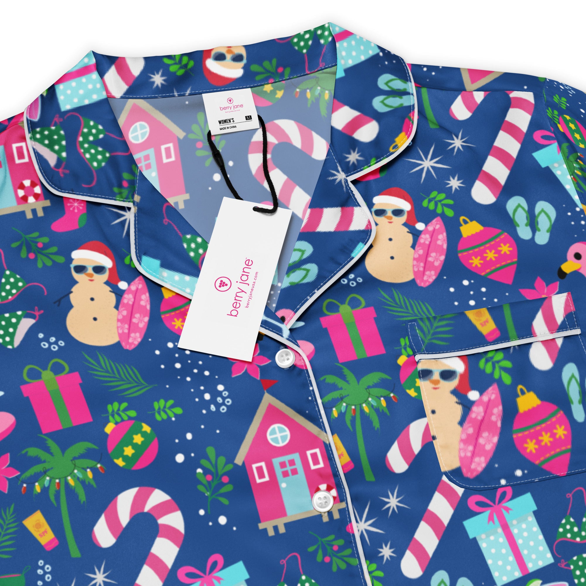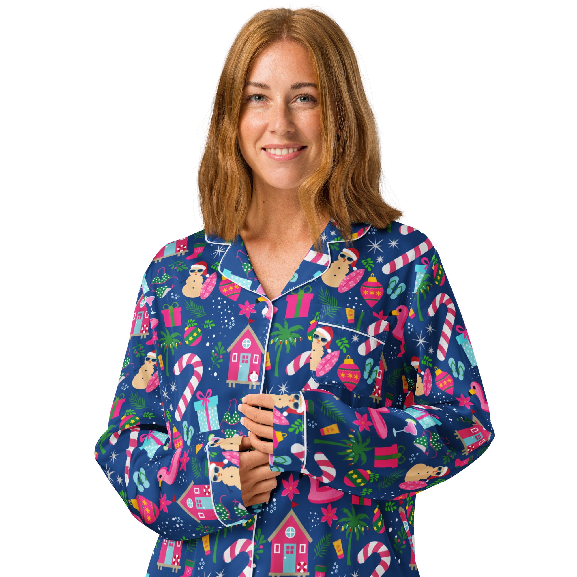 Women's Satin PJs features a Christmas at the Beach Print with Beach House, Flamingo Floaties, Flip Flops, Bikinis and Decorated Palm Trees - everything you'd expect from a beach holiday. This silky pajama top is ideal for a cozy day when you want to feel both comfortable and elegant. It features a relaxed fit, chest pocket, and elegant piping detail.