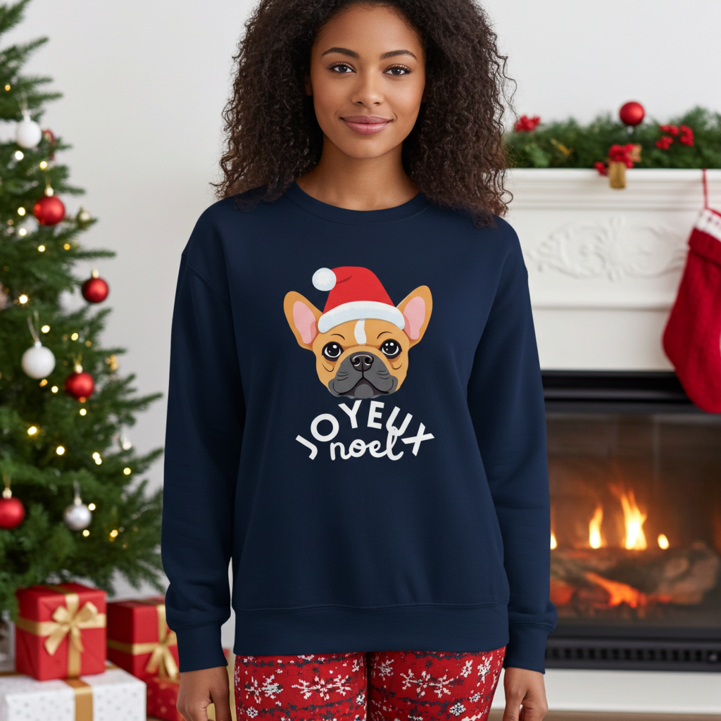 French Bulldog Joyeux Noel Christmas Sweatshirt - Perfect for dog lovers and Frenchie dog moms. Unisex sizing. Rock a classic sweatshirt silhouette with ribbed crew neck, long sleeve cuffs, and a flat hem. Layer it up or wear it on its own for a contemporary streetwear look. With the soft fleece inside and comfortable fit, it’s sure to become your favorite everyday sweater right away!