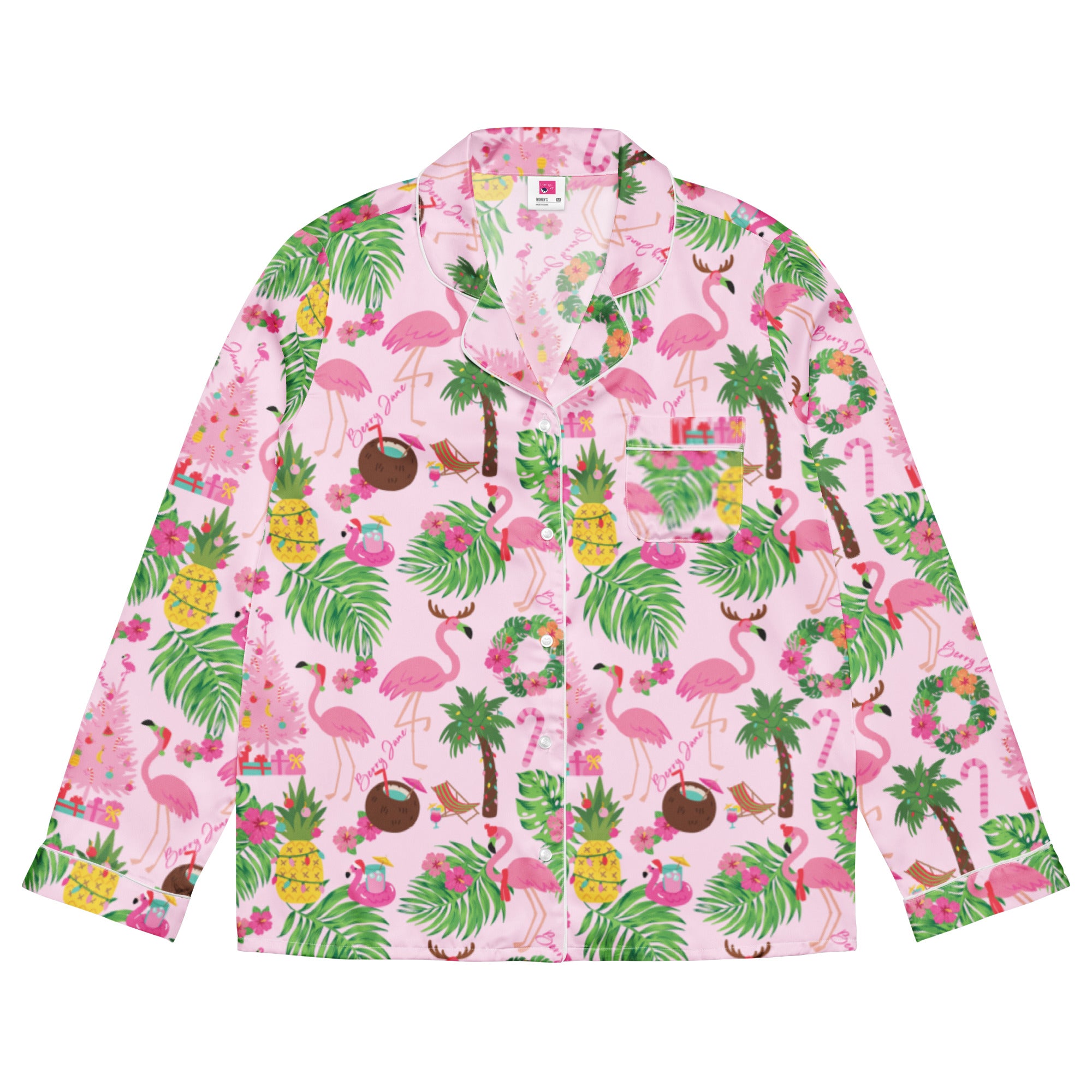 Celebrate Christmas in pink paradise with this Women’s Flamingo Beach Party Pajama Top! This tropical holiday shirt features a vibrant print of flamingos in Santa hats enjoying the beach, perfect for warm-weather festivities or sunny family traditions. The relaxed fit and soft, silk-like fabric make it ideal for lounging, gifting, or tropical vacation mornings.