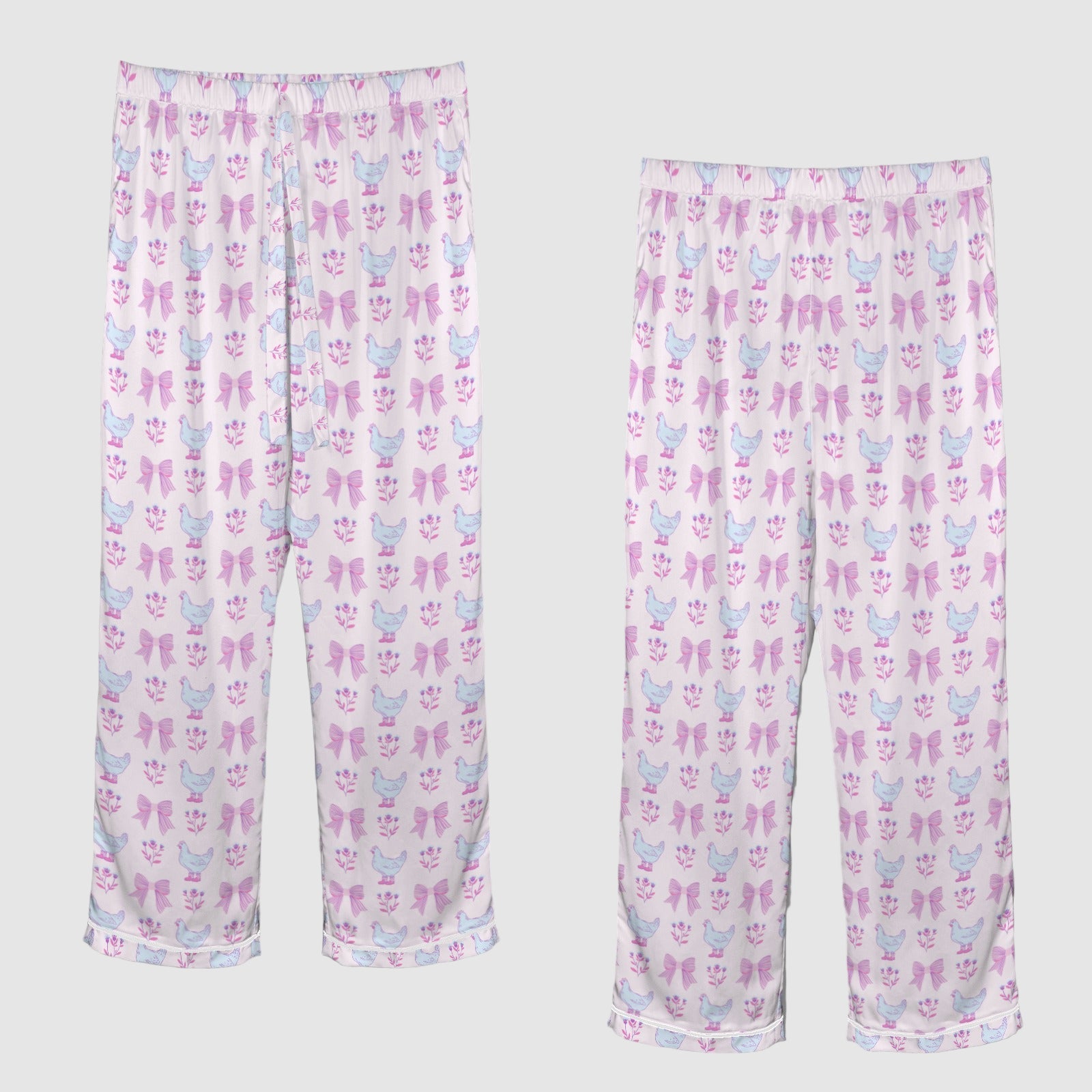 Women's 2-Piece Pajama Set - perfect for chicken and farmhouse life lovers and balmy summer nights. Featuring a cute pastel chickens and bows print, these pajamas feel like luxurious mulberry silk.