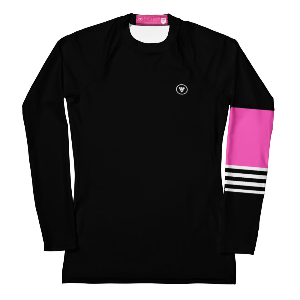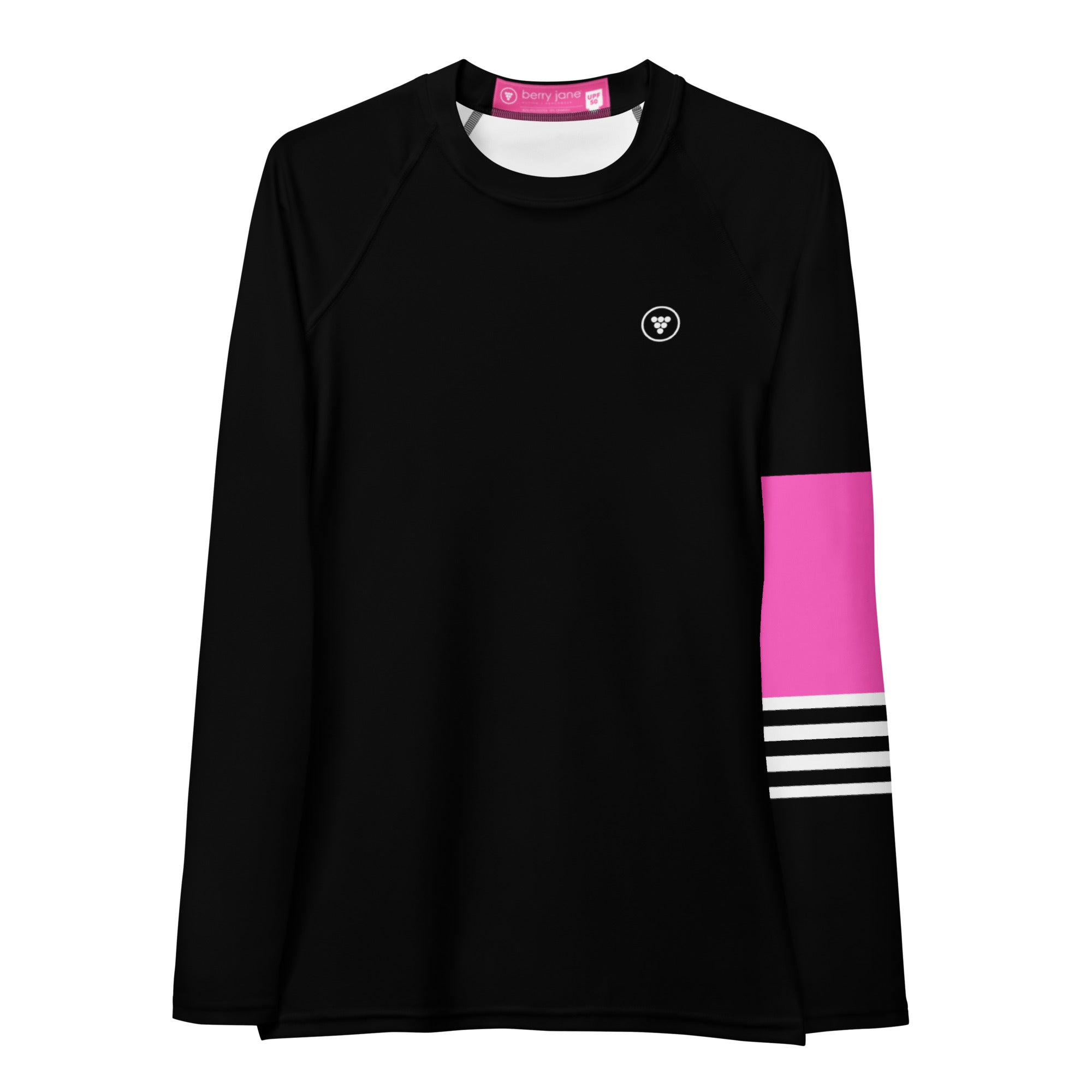 Berry Jane Women's sporty black and pink long sleeve crew neck rashguard is perfect for the beach, surfing, paddleboarding, kayaking, and more! UPF 50 Protection. This four-way stretch swim top is designed to keep you protected from harmful rays with unrestricted movement.