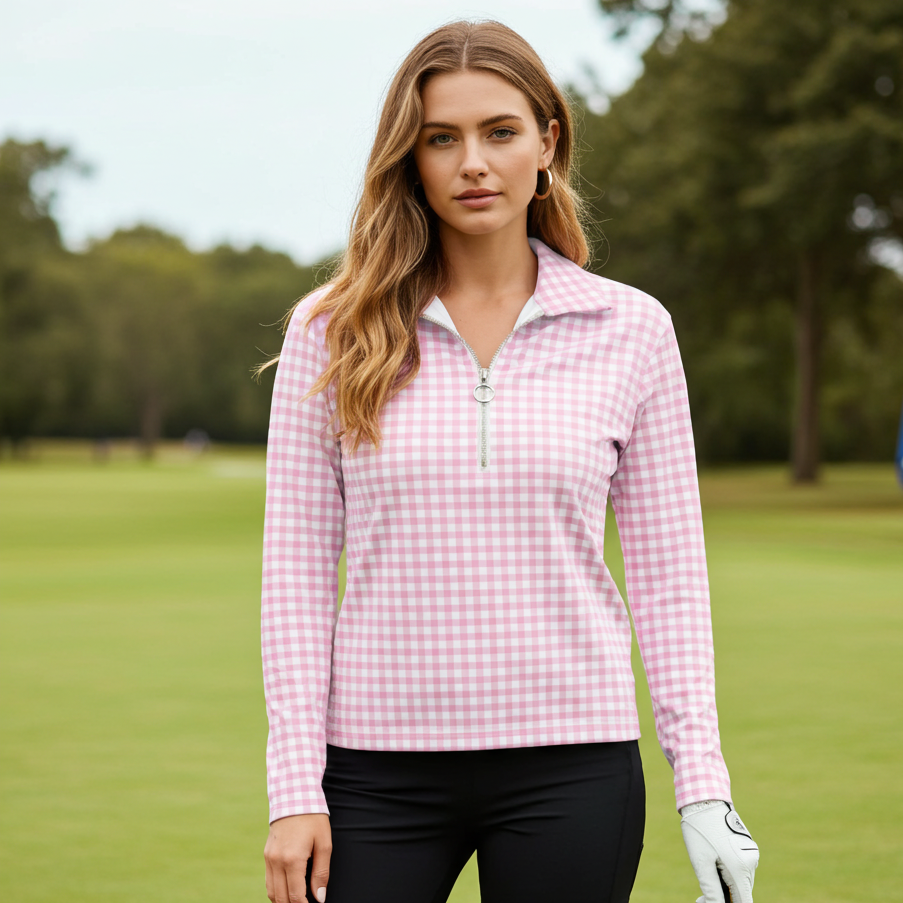 Elevate your golf attire or everyday activewear with this women's half-zip, long-sleeve athletic shirt featuring a classic pink gingham pattern for an elegant look. Great for cool weather and layering.