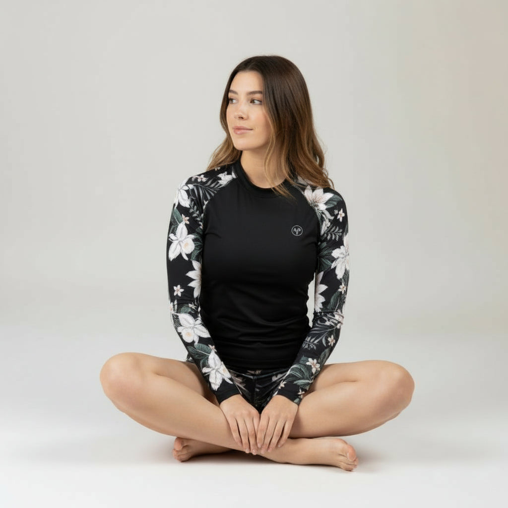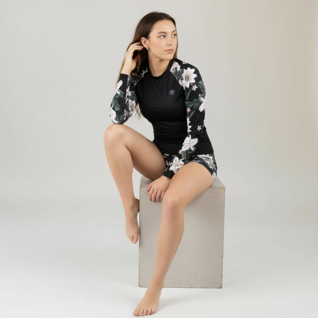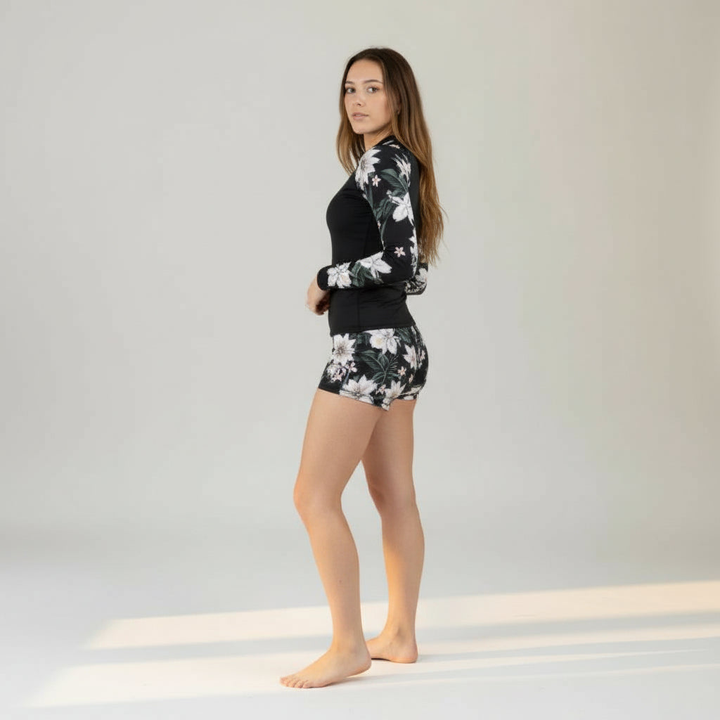 Women's Long Sleeve Rash Guard and Shorts Swimsuit Set with removable padding, elastic waistband. Shorts are 2.5" Inseam. This two-piece rash guard swimsuit is made to protect your skin from UV rays while giving you a stylish design and sporty fit. A perfect swimsuit for all-day boating, paddle boarding, surfing or swimming.