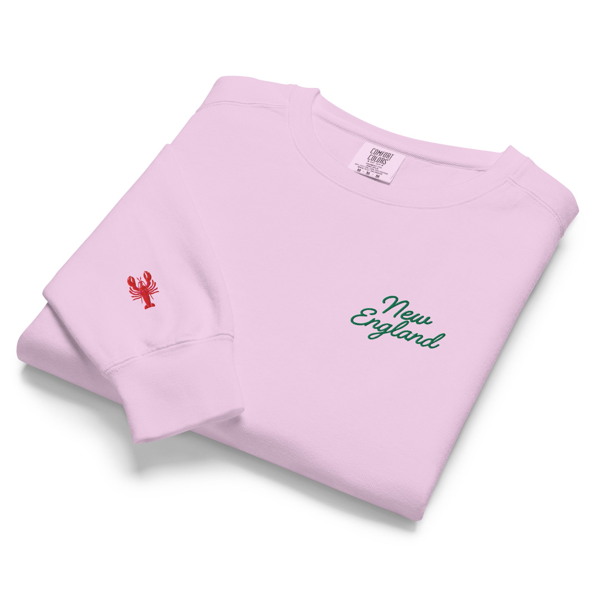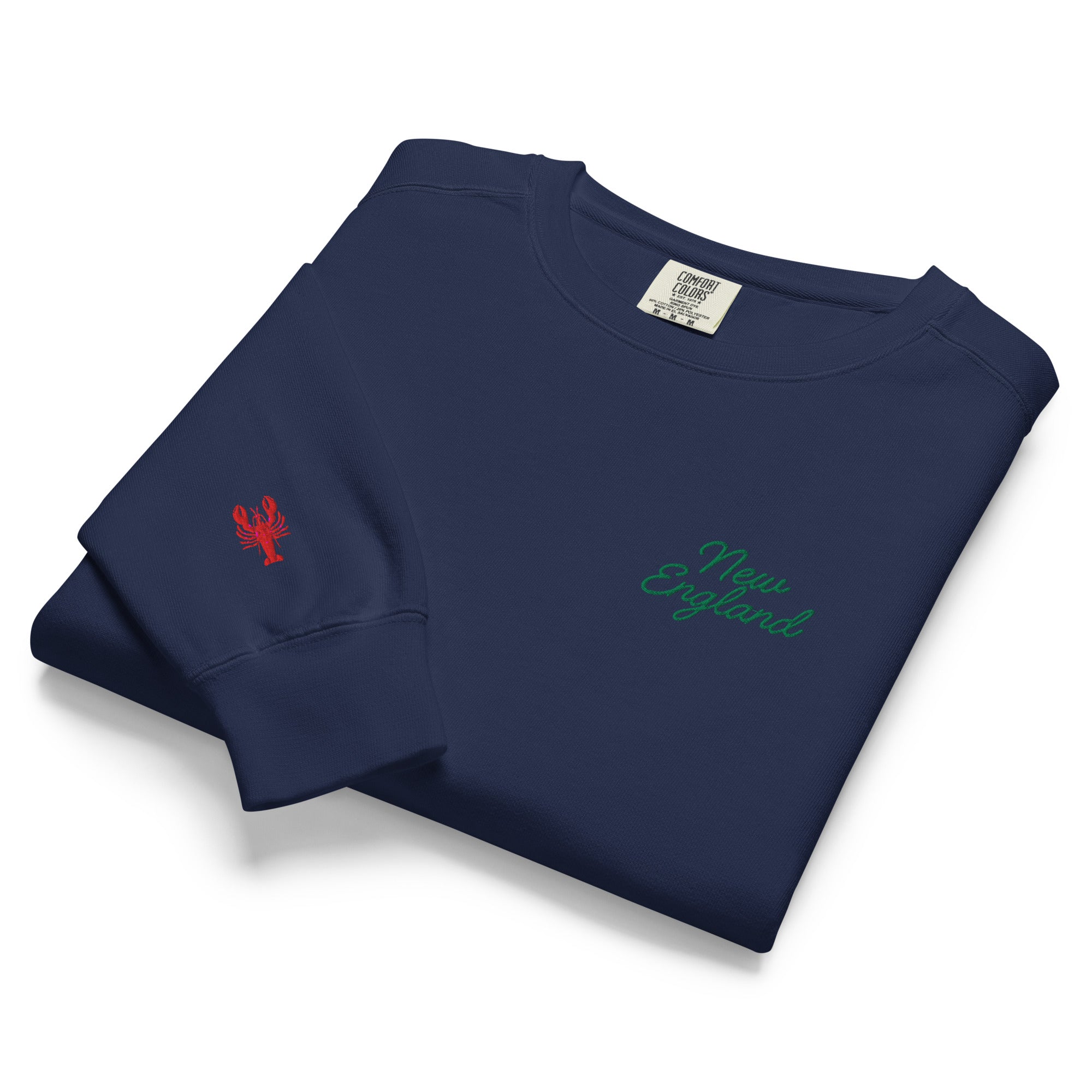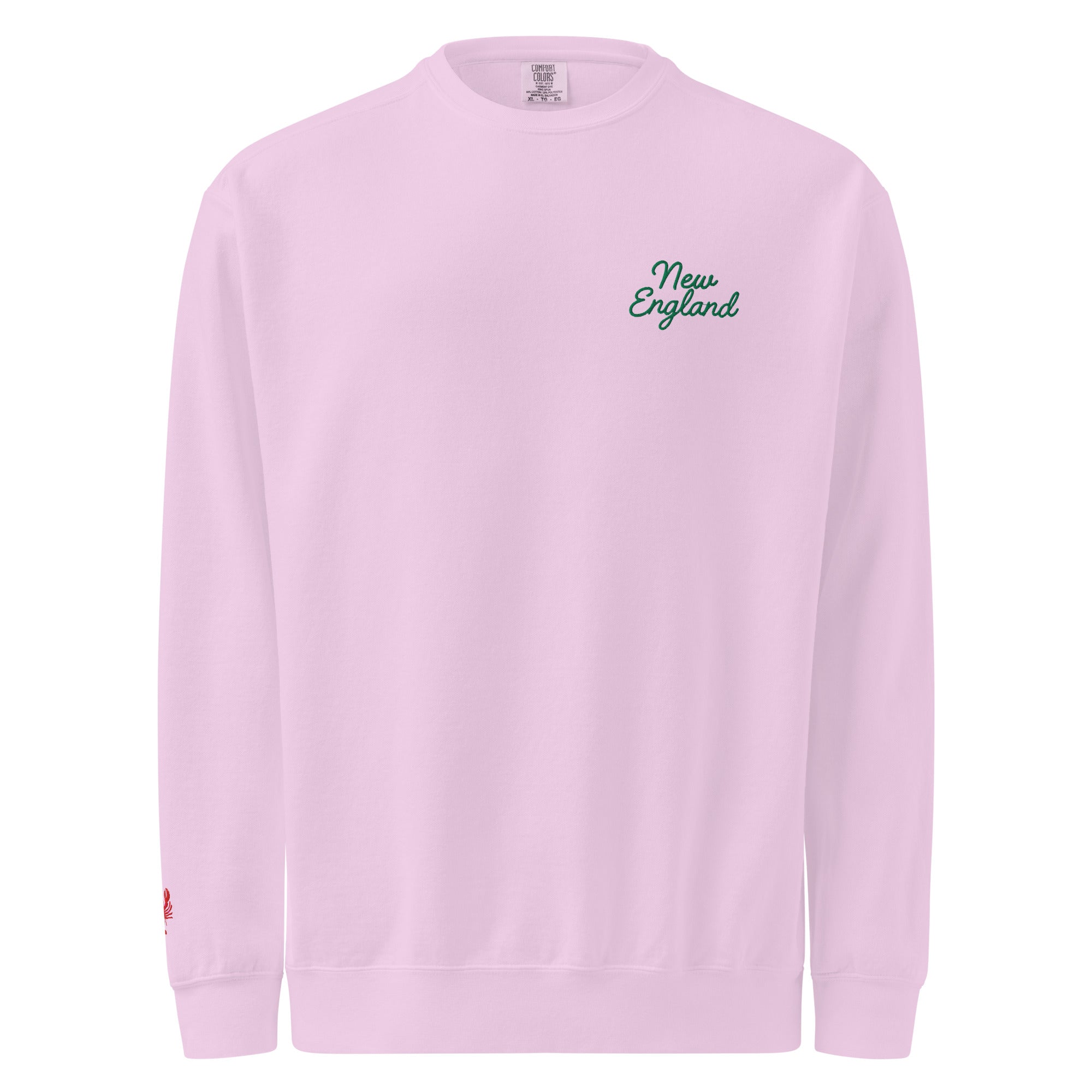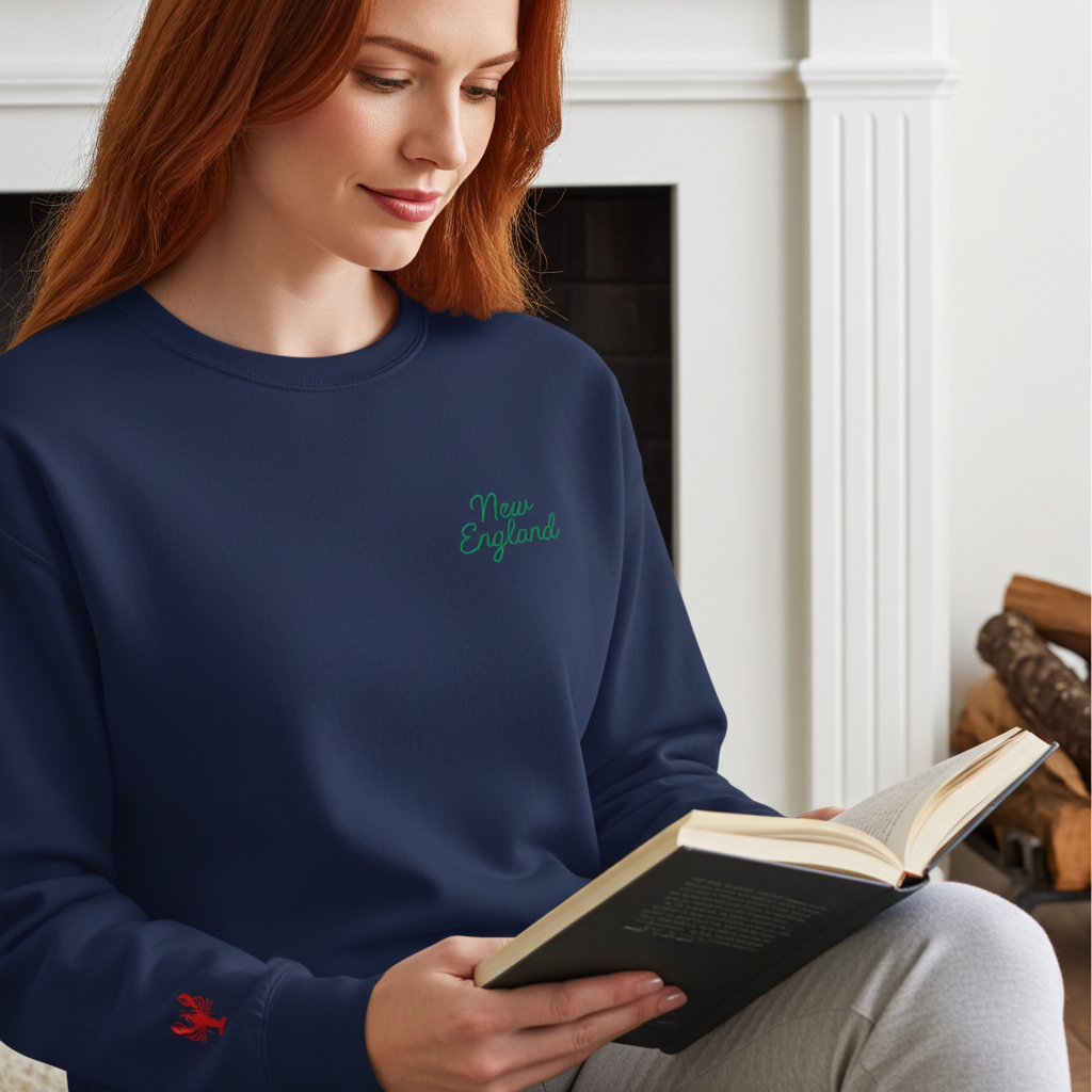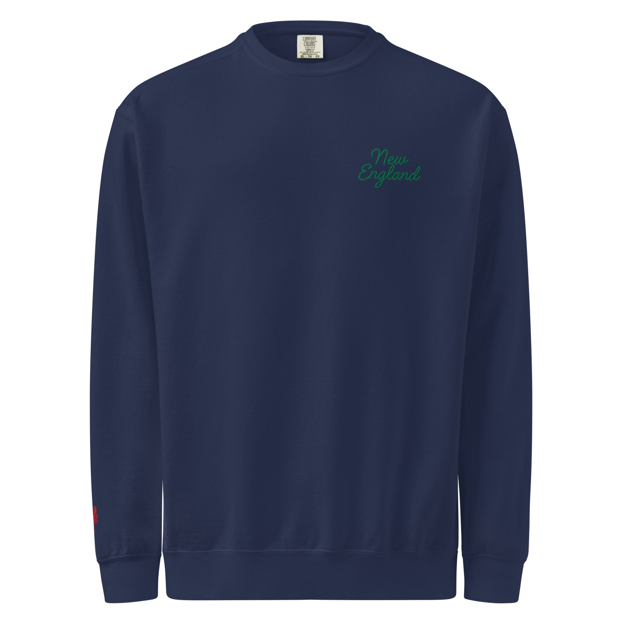 The Embroidered New England Garment-Dyed Sweatshirt combines timeless appeal with exceptional comfort. Featuring refined green script embroidery of "New England" across the chest and a distinctive lobster detail on the right sleeve, it evokes a subtle regional charm.