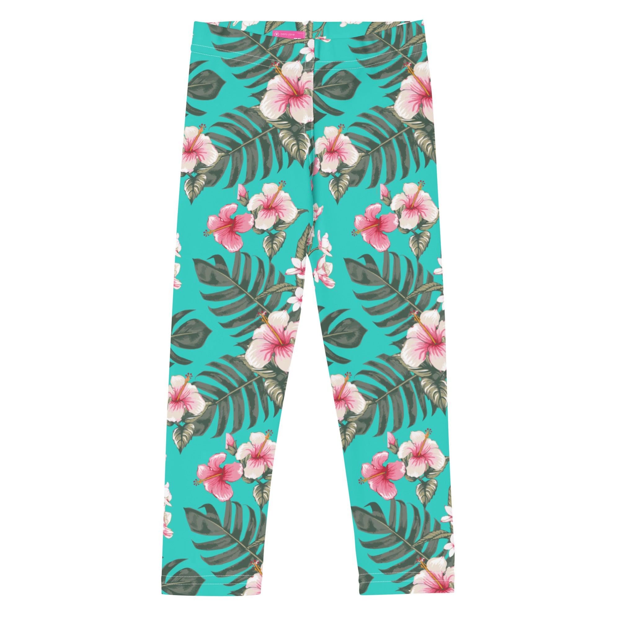 Girls UPF 50+ Sun Protection Swim Leggings, Hawaiian Tropical Turquoise