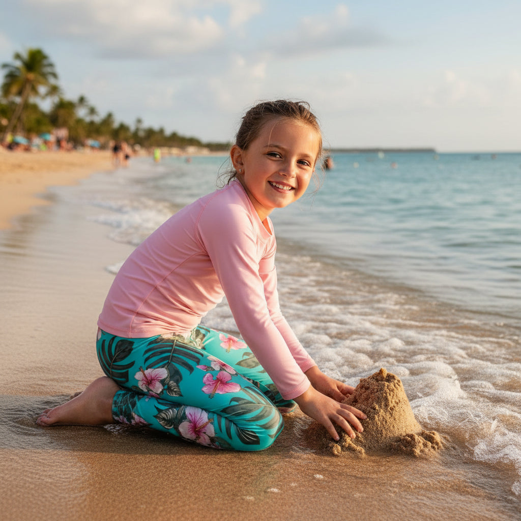 Keep your daughter protected and comfortable in the water with these vibrant Hawaiian-inspired swim leggings. Made from UPF 40+ fabric for better sun defense, they shield delicate skin from harmful rays while the stretchy waistband moves with her every splash and adventure. Perfect for beach days, pool parties, and water-loving kids.