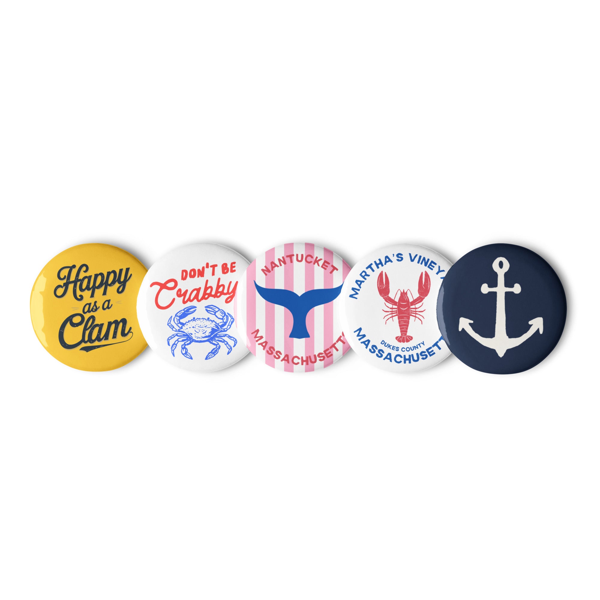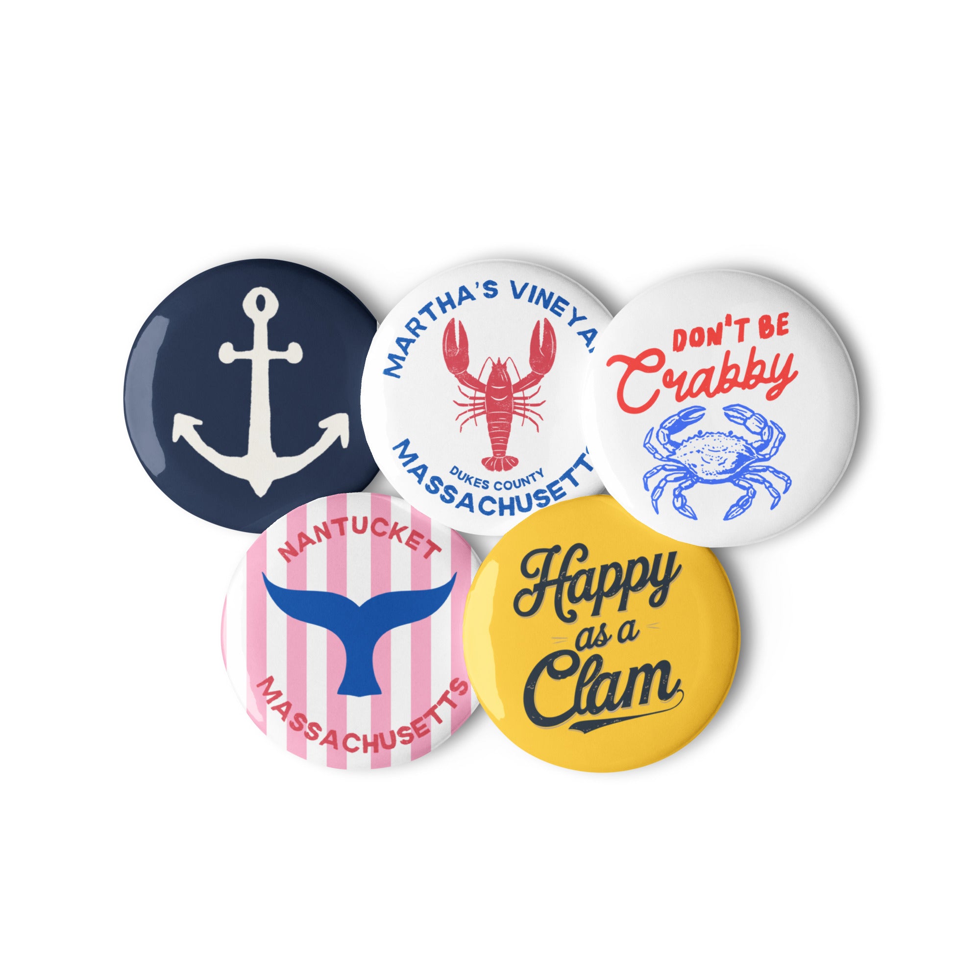 New England Coastal Pin-Back Button Set - Express your love of coastal living or New England vacations with these top-quality pin buttons. Lightweight, sturdy, and easy to attach, they feature a scratch and UV-resistant coating with a glossy finish for lasting beauty. Show off your passions and add personality to your beach tote, clothing, or accessories with these vibrant buttons.
