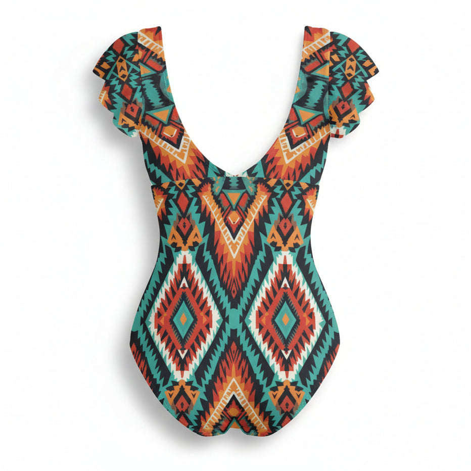 Women's one-piece swimsuit blends bohemian flair with southwestern charm. The twist-front design flatters your silhouette while ruffled sleeves add a flirty, feminine touch. Perfect for poolside adventures or beach getaways, this swimsuit brings vibrant personality to your summer adventures.