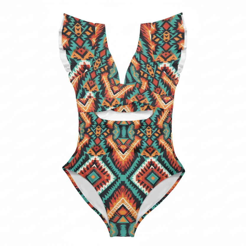 Women's Boho Southwestern Twist Front Ruffle Sleeve One-Piece Swimsuit