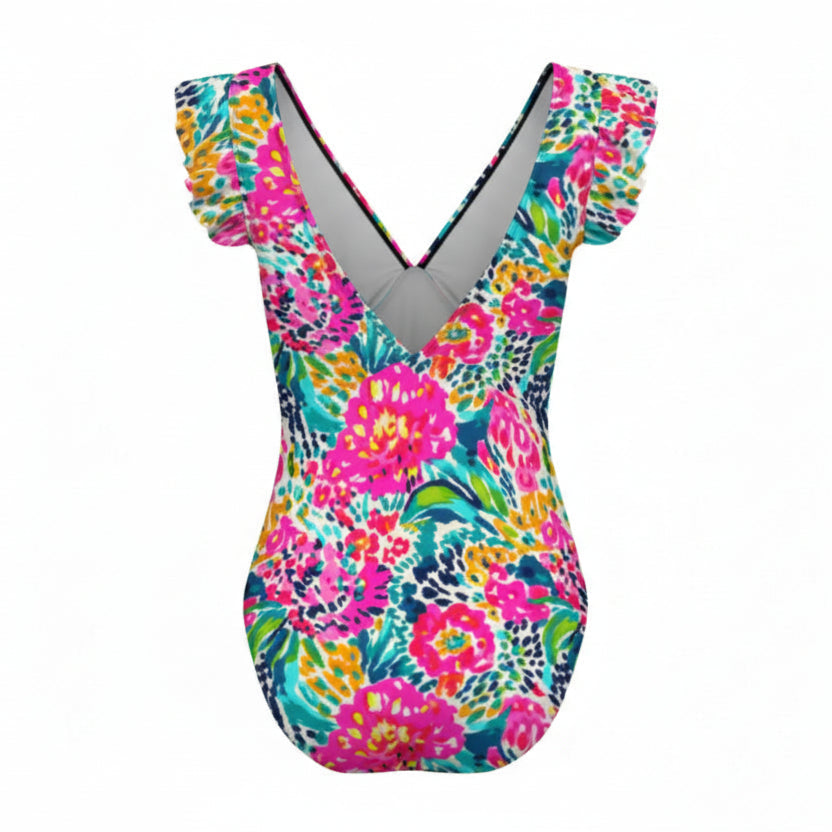 Colorful one-piece featuring a flattering deep V-neckline and playful ruffle cap sleeves. The low-cut back adds modern flair while the classic bum coverage keeps you comfortable poolside or beachside. Crafted from lightweight, quick-dry fabric that moves with you, this vibrant floral design brings tropical energy to every splash and sunbathing session.