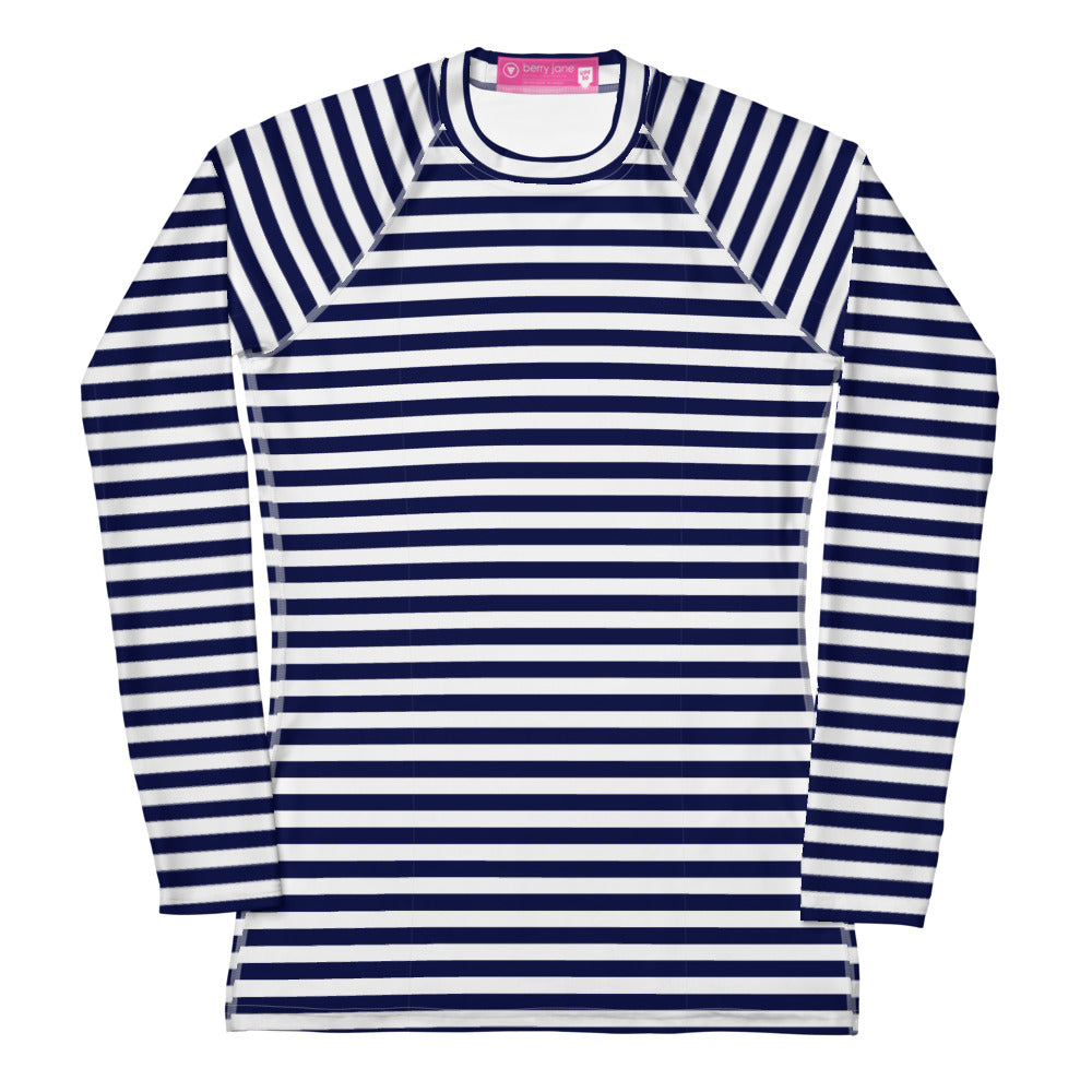 Berry Jane Women's Navy White Nautical Stripe Long Sleeve Crew Rashguard is perfect for the beach, paddle boarding, kayaking, and more! This UPF 50 four-way stretch swim top is designed to keep you protected from harmful rays with unrestricted movement.