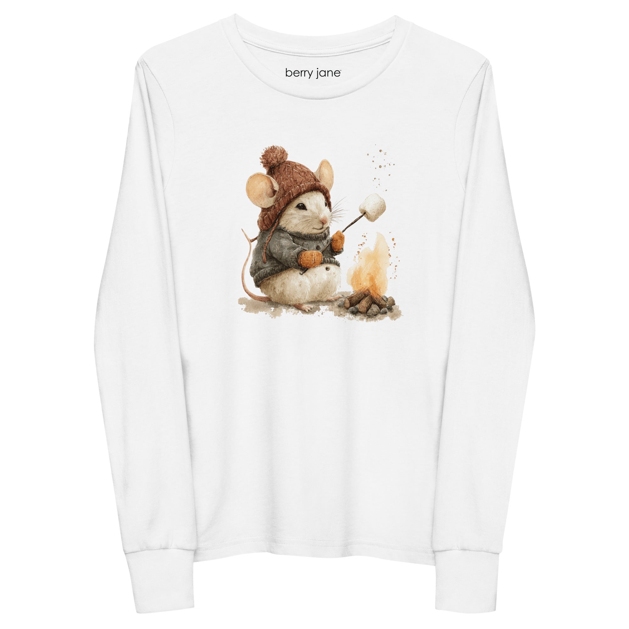 If you give a mouse a marshmallow... This adorable long sleeve tee shows a tiny mouse toasting marshmallows, perfect for kids who love camping, s'mores, or fun and cozy style. Crafted from soft and durable Airlume combed and ringspun cotton, it offers a comfy regular fit with a classic crew neck and ribbed cuffs to keep little ones comfy all day.