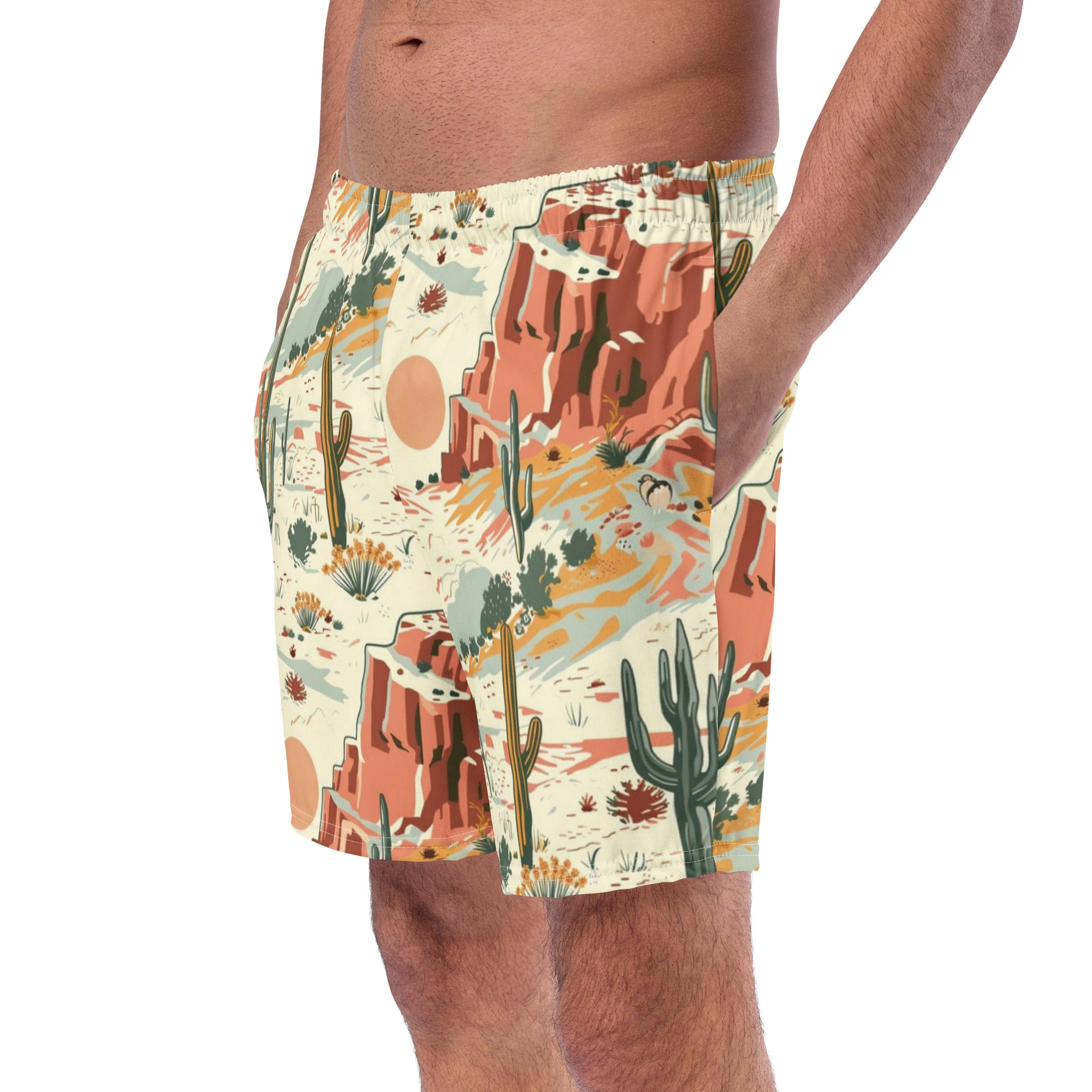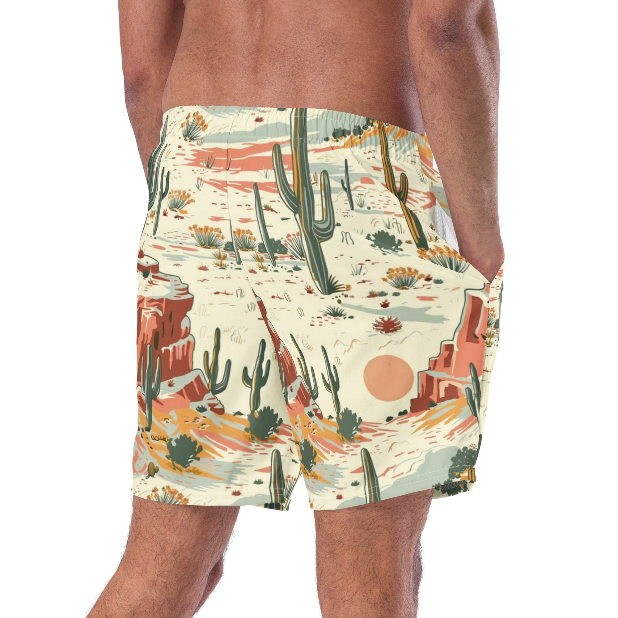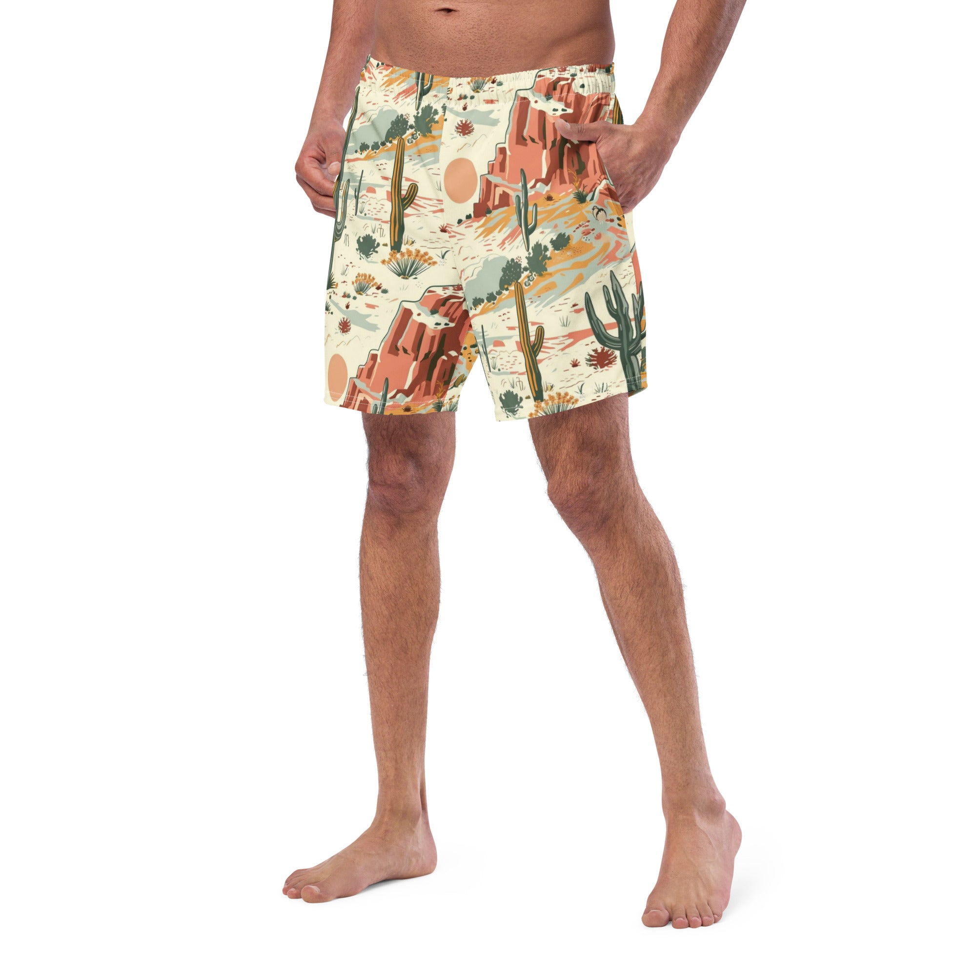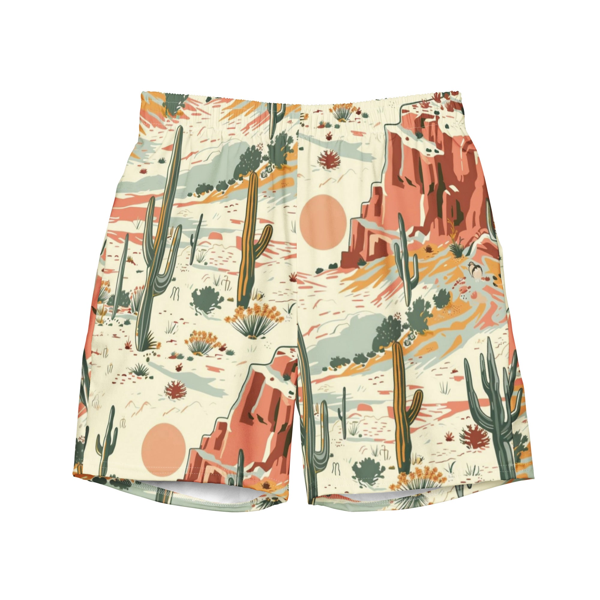 Hit the water in style with these Men’s Western Desert Swim Trunks, featuring a bold and rugged desert landscape print inspired by the American Southwest - Vibrant Western desert print with cacti, red rock canyons, and sun motifs. Designed for comfort, performance, and sustainability, these trunks are perfect for Lake days, beach vacations, pool parties, paddleboarding, or lounging under the sun.