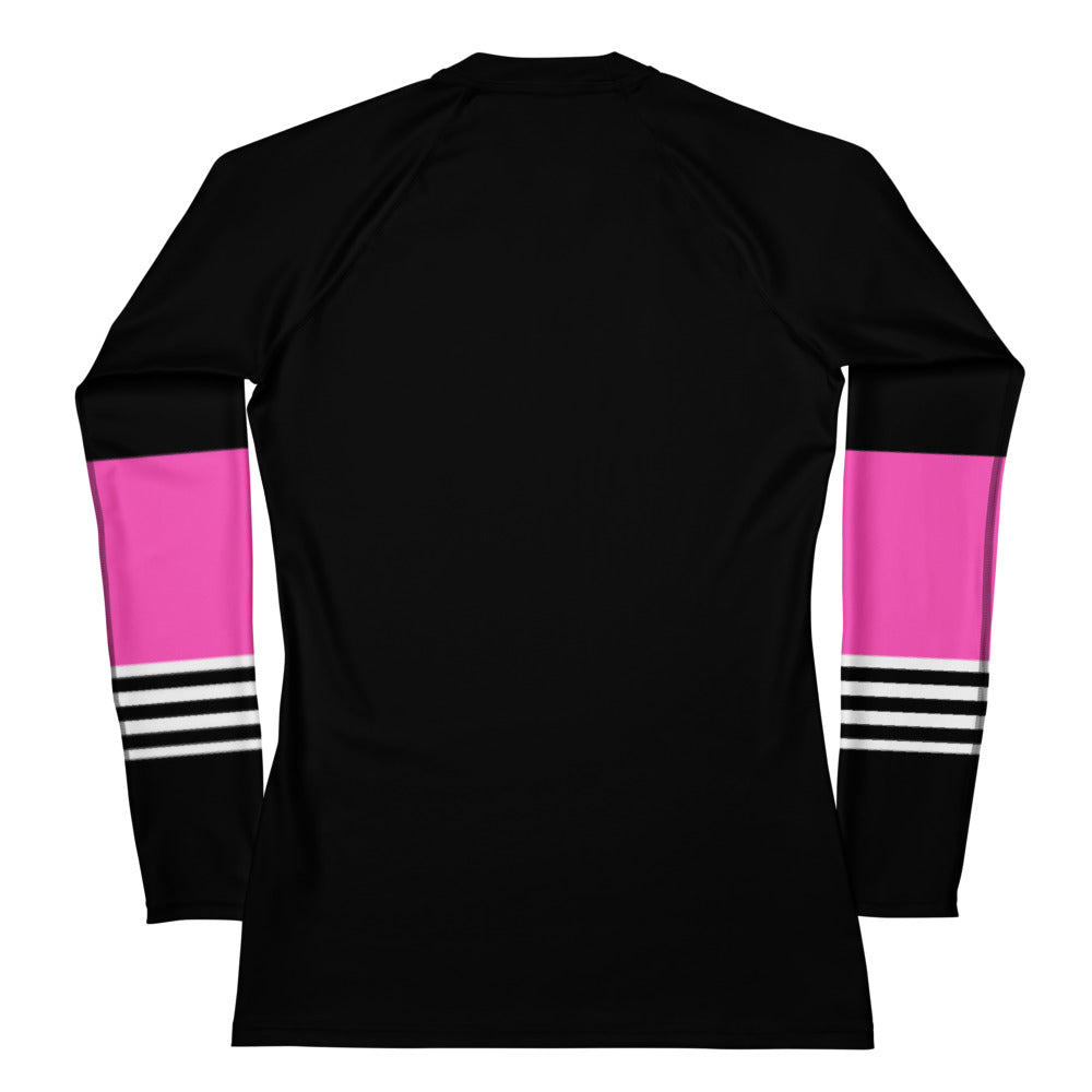 Berry Jane Women's sporty black and pink long sleeve crewneck rashguard are perfect for the beach, surfing, paddleboarding, kayaking, and more! UPF 50 Protection. This four-way stretch swim top is designed to keep you protected from harmful rays with unrestricted movement.