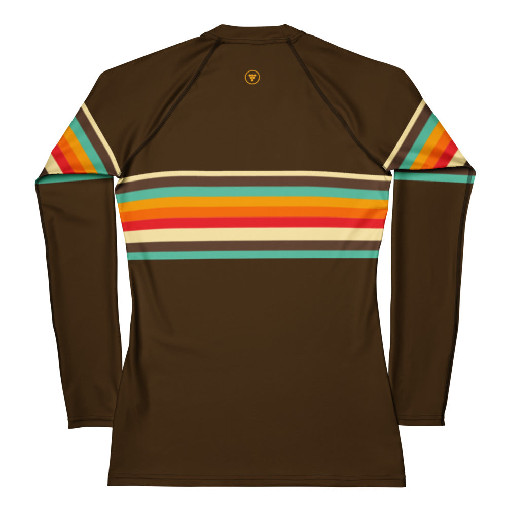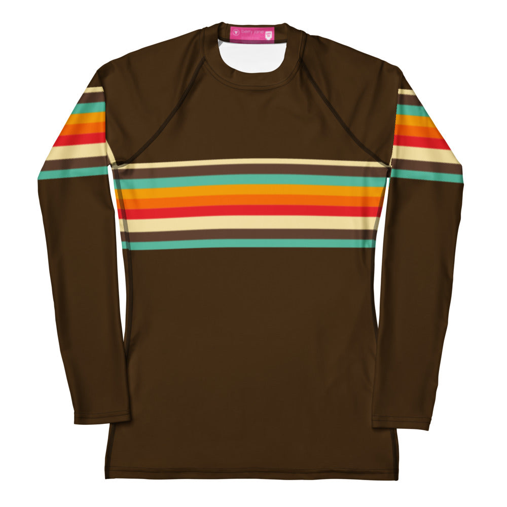 Berry Jane Women's Brown 70s Vintage Stripe long sleeve crew rash guard is perfect for the beach, paddle boarding, kayaking, and more! This four-way stretch swim top is designed to keep you protected from harmful rays with unrestricted movement. UPF 50+ Sun Protection.